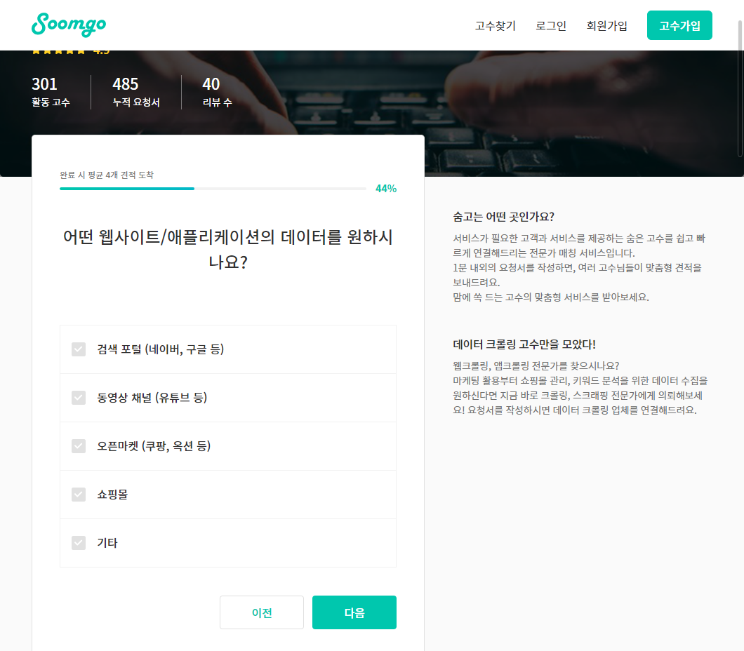 데이터 크롤링 관련 과업은 견적 요청 시 평균 네 개의 견적서를 보내준다고 하네요.