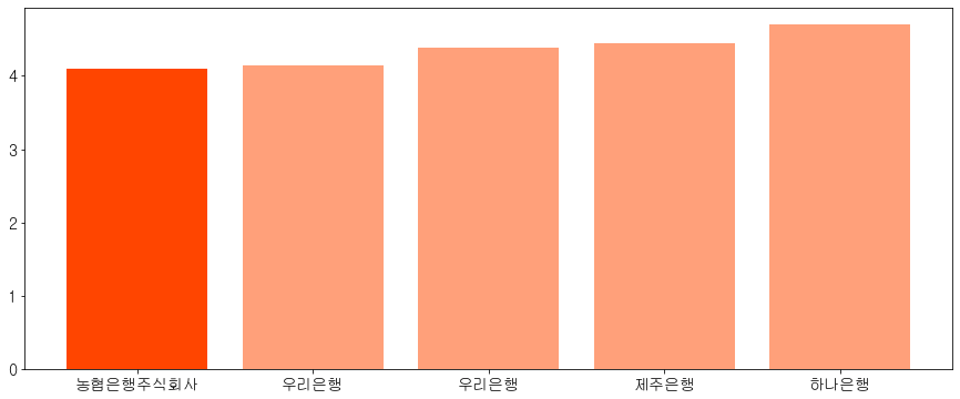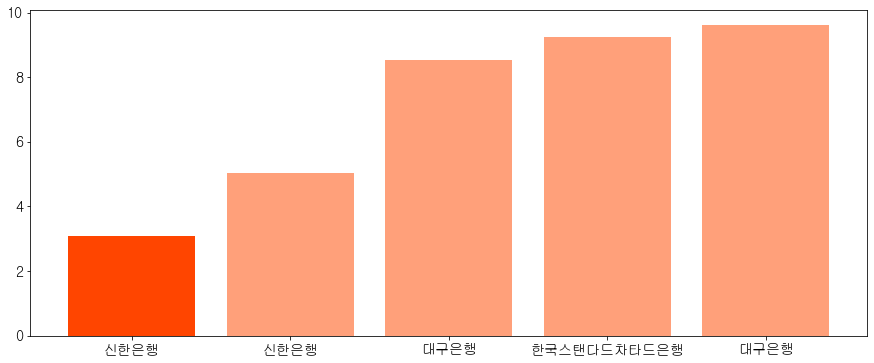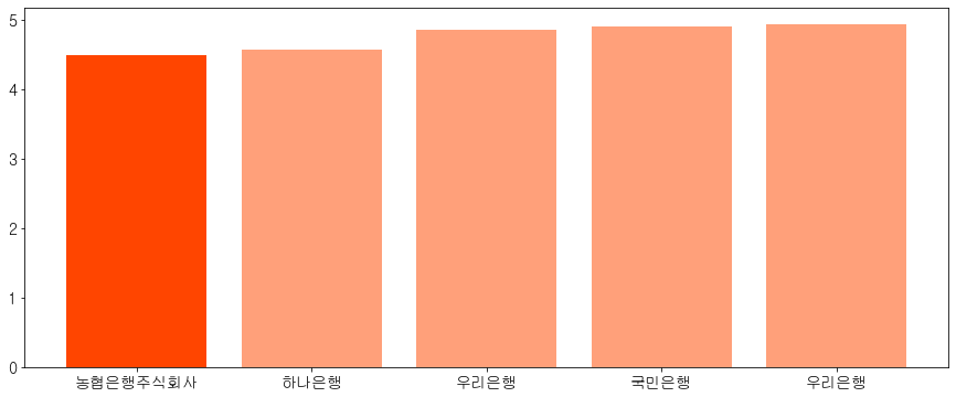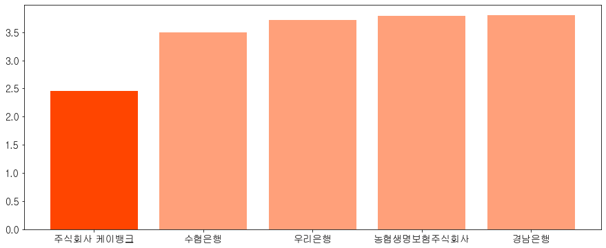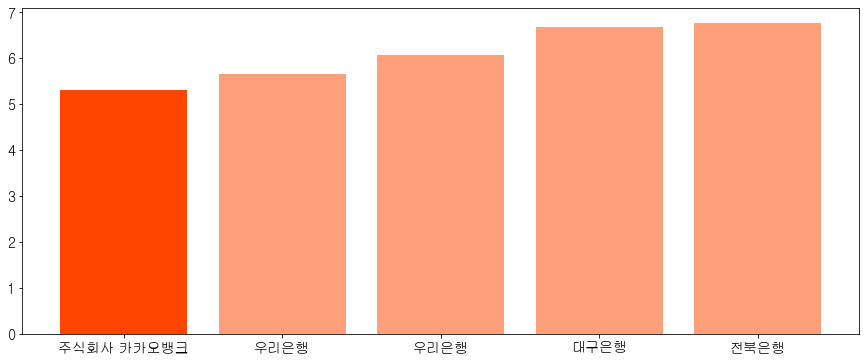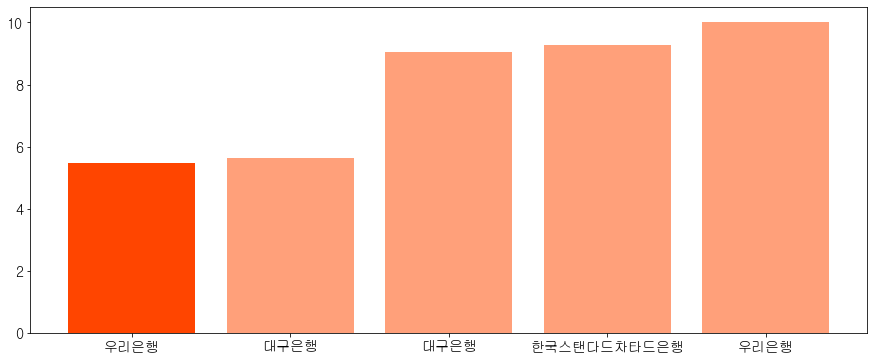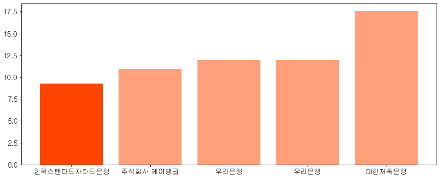 아래 차트 보면 우리은행이 두 번 등장하는데 아마 한 금융기관 내에서도 신용대출 상품(ex. 일반 신용대출, 마이너스통장)이 여러 가지라 그런 듯합니다. 원본 데이터에는 상품정보까지 나와있으니 궁금하시면 댓글 주세요. 우리은행은 KCB의 신용점수를 참고합니다.