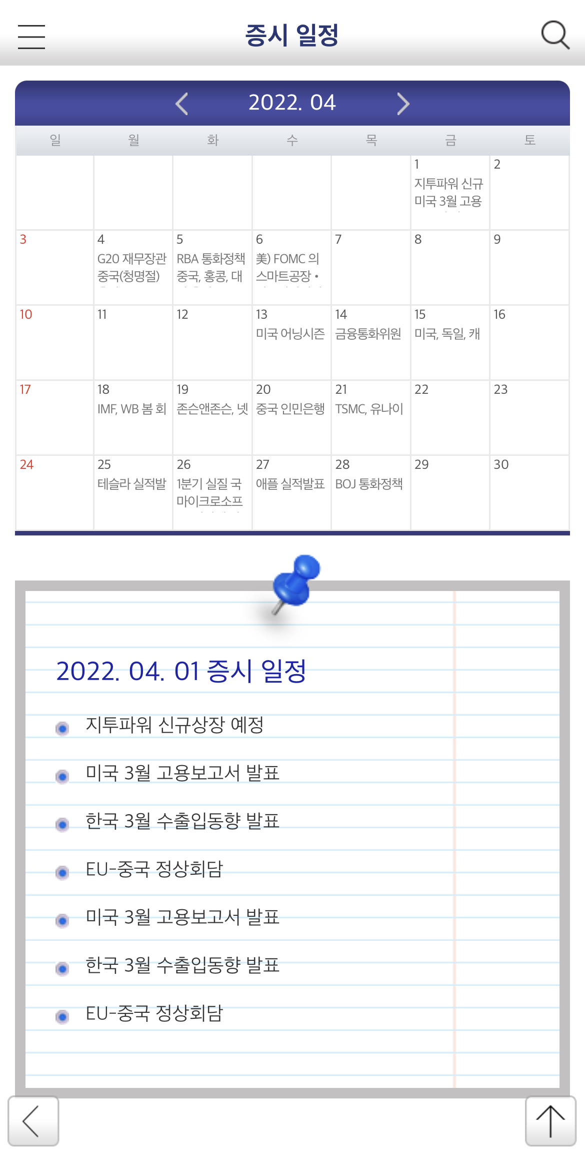 주식투자를 하기 때문에 평소에 증시 캘린더를 즐겨 보는 편입니다. 시중 증권사들 대부분이 나름대로의 형식으로 증시 일정을 정리해 제공하고 있지만, 제가 가장 즐겨 찾아보는 캘린더는 키움 모바일 증시 캘린더입니다. 키움증권에서는 증시 캘린더를 PDF로도 제공하고 있는데 정보가 너무 많아 모바일 가독성이 떨어져서요. 저는 별도로 제공되고 있는 모바일 증시 캘린더를 주로 참고합니다. 아래와 같이 생겼습니다.