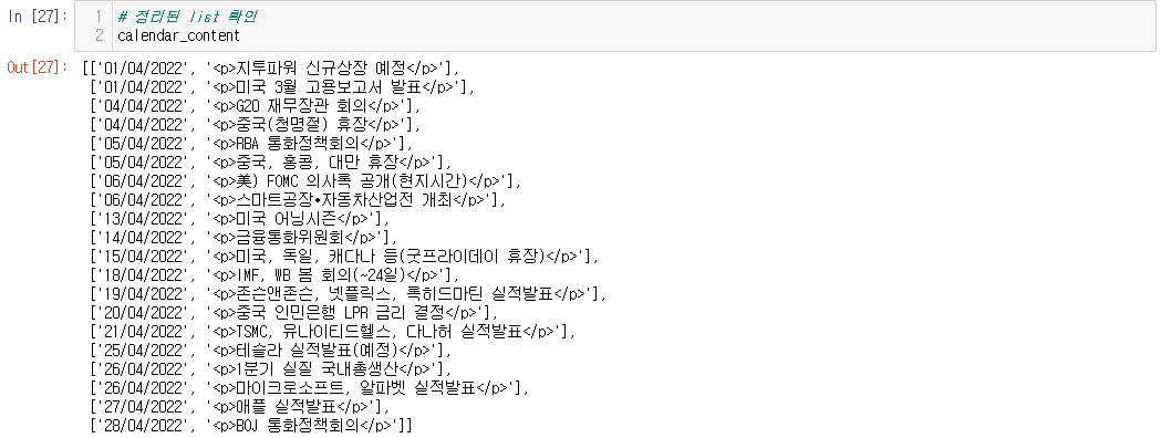 위의 결과로 calendar_contet 리스트의 요소들이 채워졌을 텐데요. 그 결과물을 확인하는 코드입니다.