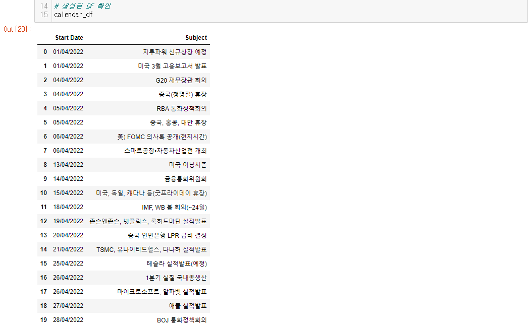 의도한 대로 이벤트(Subject 컬럼)의 <p> 태그는 잘 제거되었고, 데이터 형식도 데이터프레임으로 잘 변형됐네요. 아! 일자 형식이 dd/MM/yyyy인 이유는 구글 캘린더에 일정을 연동하기 위함입니다. 구글에서 제공하는 CSV → 캘린더 연동 가이드를 보니 날짜 형식을 dd/MM/yyyy로 요구하고 있더라고요.