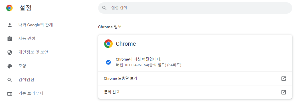 크롬 브라우저 우상단의 메뉴 > 도움말 > Chrome 정보 메뉴에서 내 크롬의 버전을 확인할 수 있습니다.