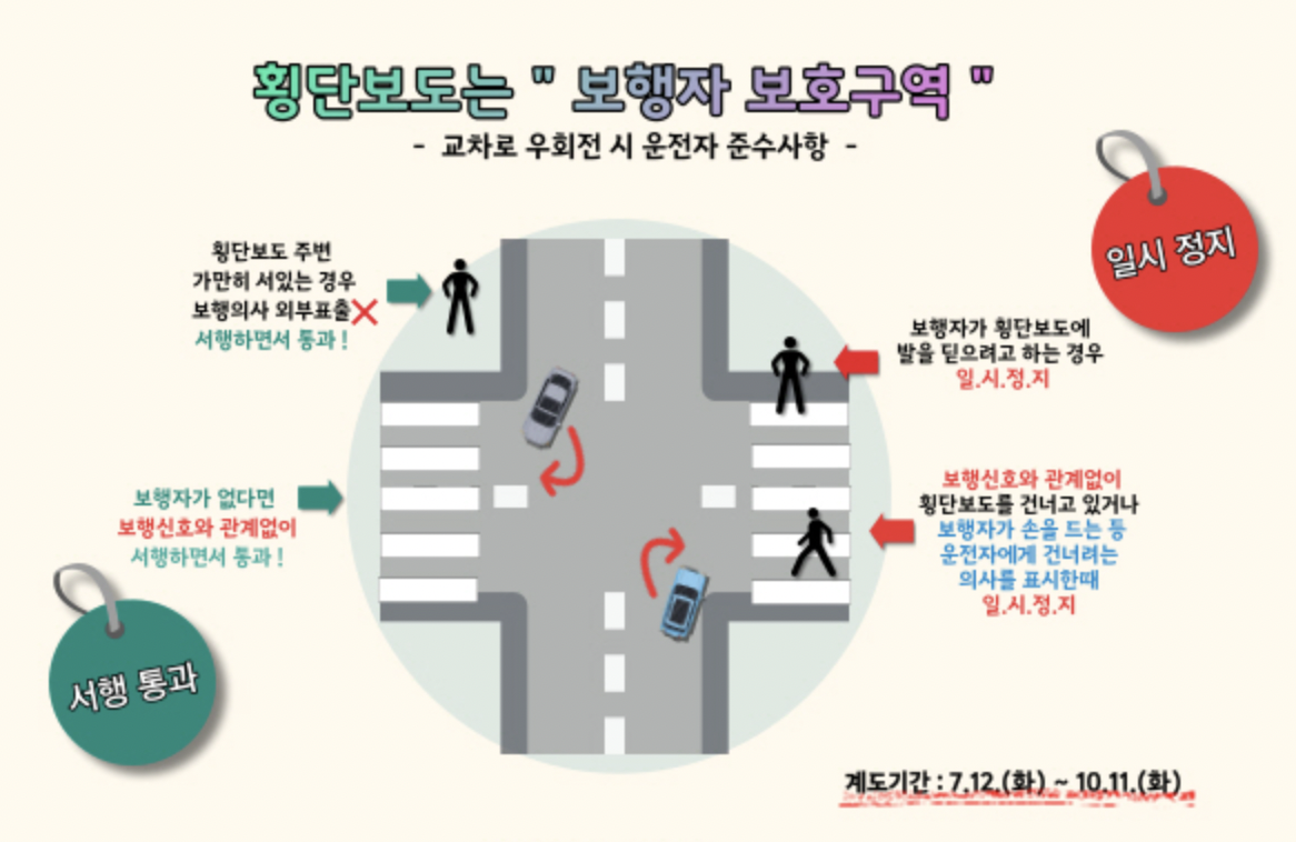 * 도로교통법 개정 전에는 보행자가 횡단보도를 건너고 있을 때만 차량이 횡단보도 앞에 정차하도록 했지만, 개정 후에는 '보행자가 통행하려고 할 때'에도 일시 정지해야 한다는 점이 핵심입니다.
