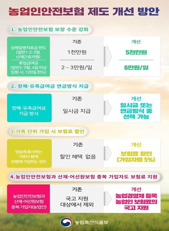 * 농업인안전보험 가입자가 장해를 입거나 사망했을 때 받게 되는 장해급여금과 유족급여금은 연금 방식으로도 수령할 수 있게 됩니다. 여태까지는 일시금으로만 받을 수 있었지만 앞으로는 일시금과 연금 방식 중에서 선택할 수 있습니다.