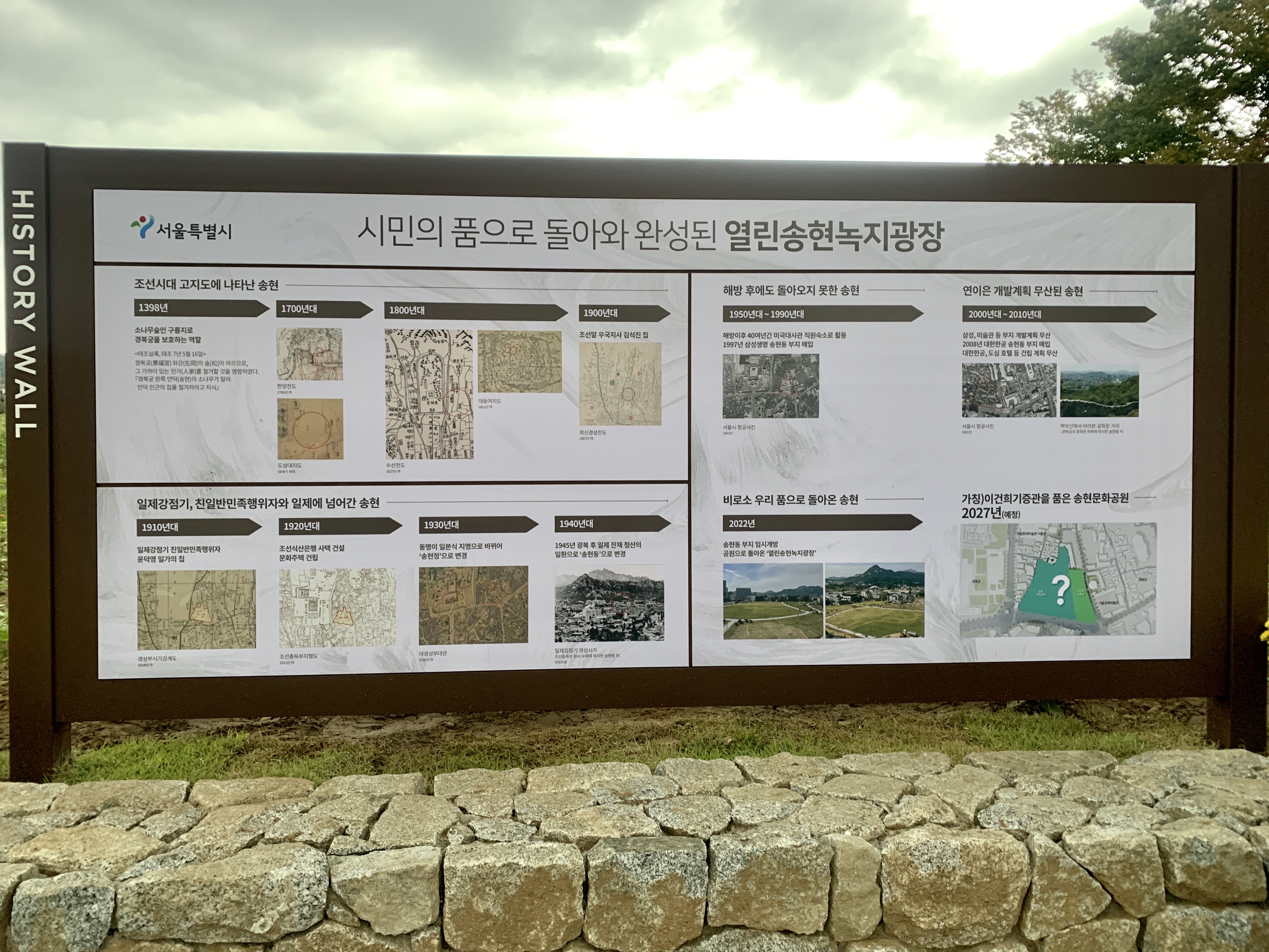 자주 다니던 곳이라 그런지 막혀있던 것이 걷어진 후의 시원하고 엄청난 개방감이 크게 느껴졌다. 외국인들도 워낙에 많이 오는 곳이기 때문에 외국인들도 인왕산의 자태부터 주변에 경복궁, 북촌, 안국동 등의 아름다운 매력을 더 많이 즐길 수 있을 것 같았다. 열린송현녹지 광장 앞에는 히스토리 월이 있다.