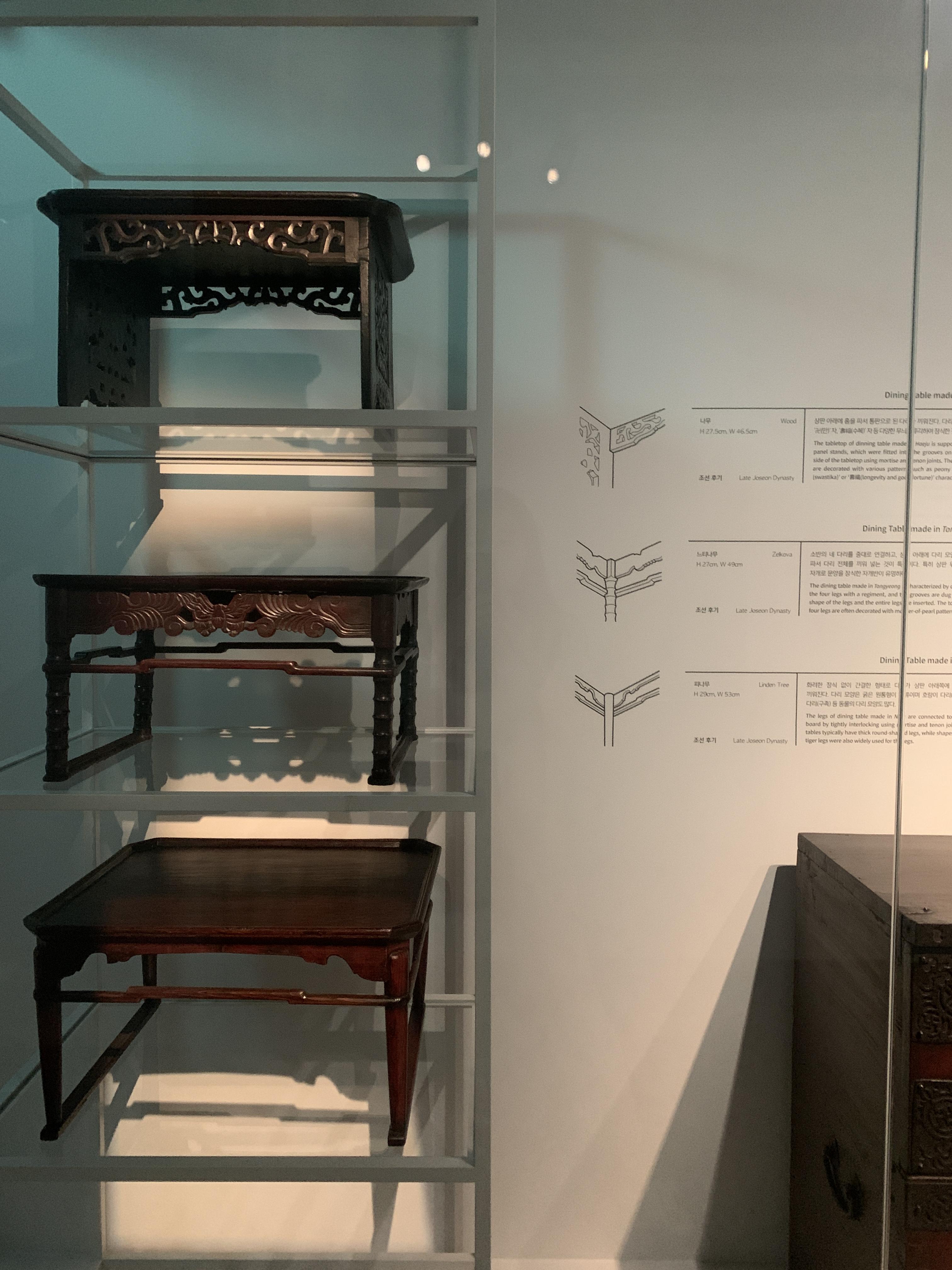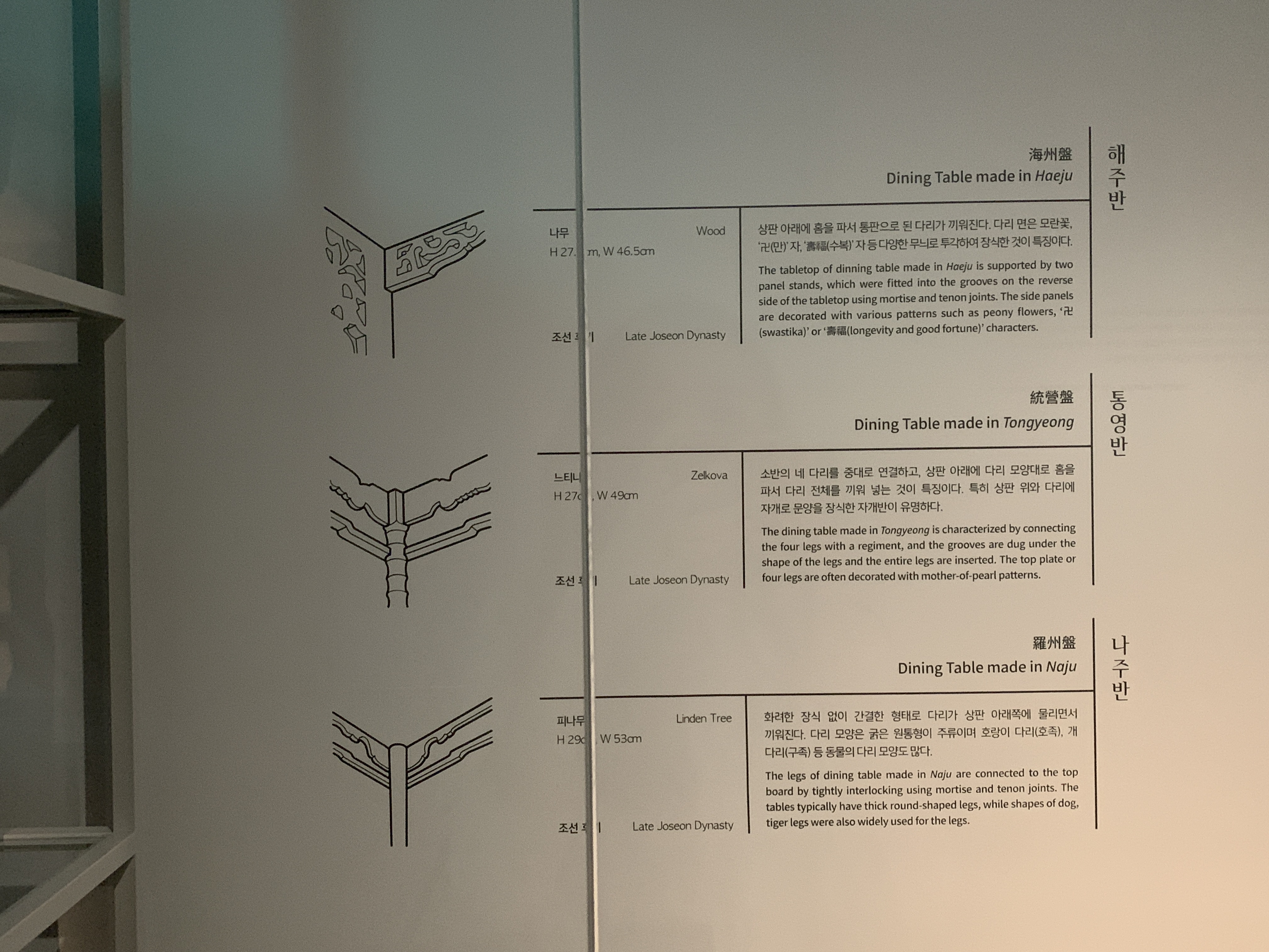 이 옆쪽에는 소반이 전시되어 있다. 대충 소반이라고 통틀어 알고 있는데 소반도 종류가 있다. 소반마다 하단과 같은 설명이 있어 특징을 보면서 소반을 보니 확실히 각각의 소반이 다 다르게 보였다.