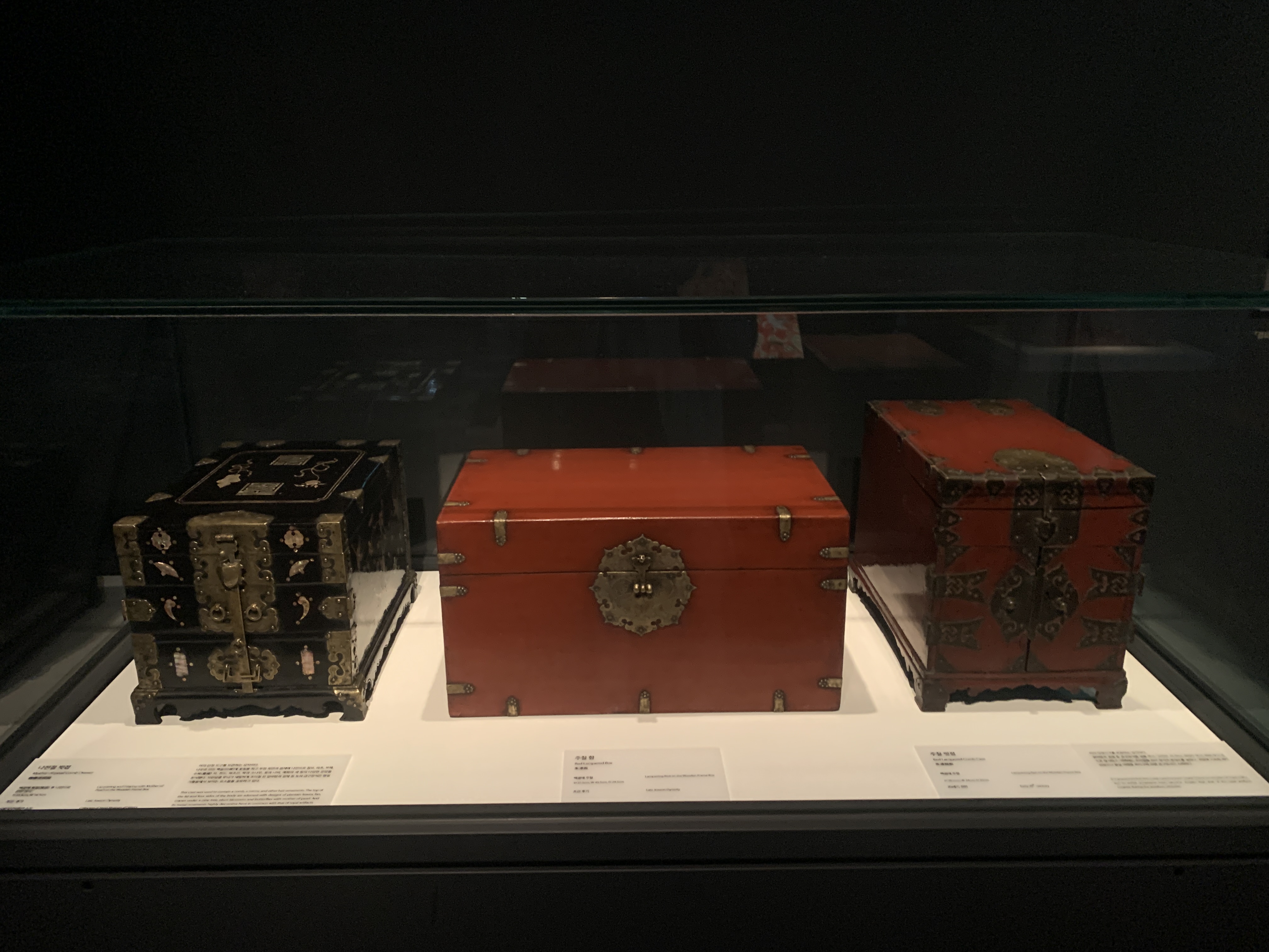 아름답고 화려한 이 함의 이름은 화각함이다. 소뿔을 얇게 저며 각지를 만들고 그 뒷면에 그림을 그린 후에 이것을 나무로 만든 함 표면에 붙혀서 장식한 것이라고 한다. 듣기만 해도 장인의 손길이 필요할 것만 같다. 이 화각기법으로 제작된 목가구들은 희귀하고 가공하는 방식도 어렵기 때문에 주로 왕실이나 상류층이 사용했다고 한다. 함 앞바탕의 장석 등 조이질로 문양을 표현한 금속 장식기법은 왕실 제작품들에서 보이는 특징이 있다고 쓰여있다.