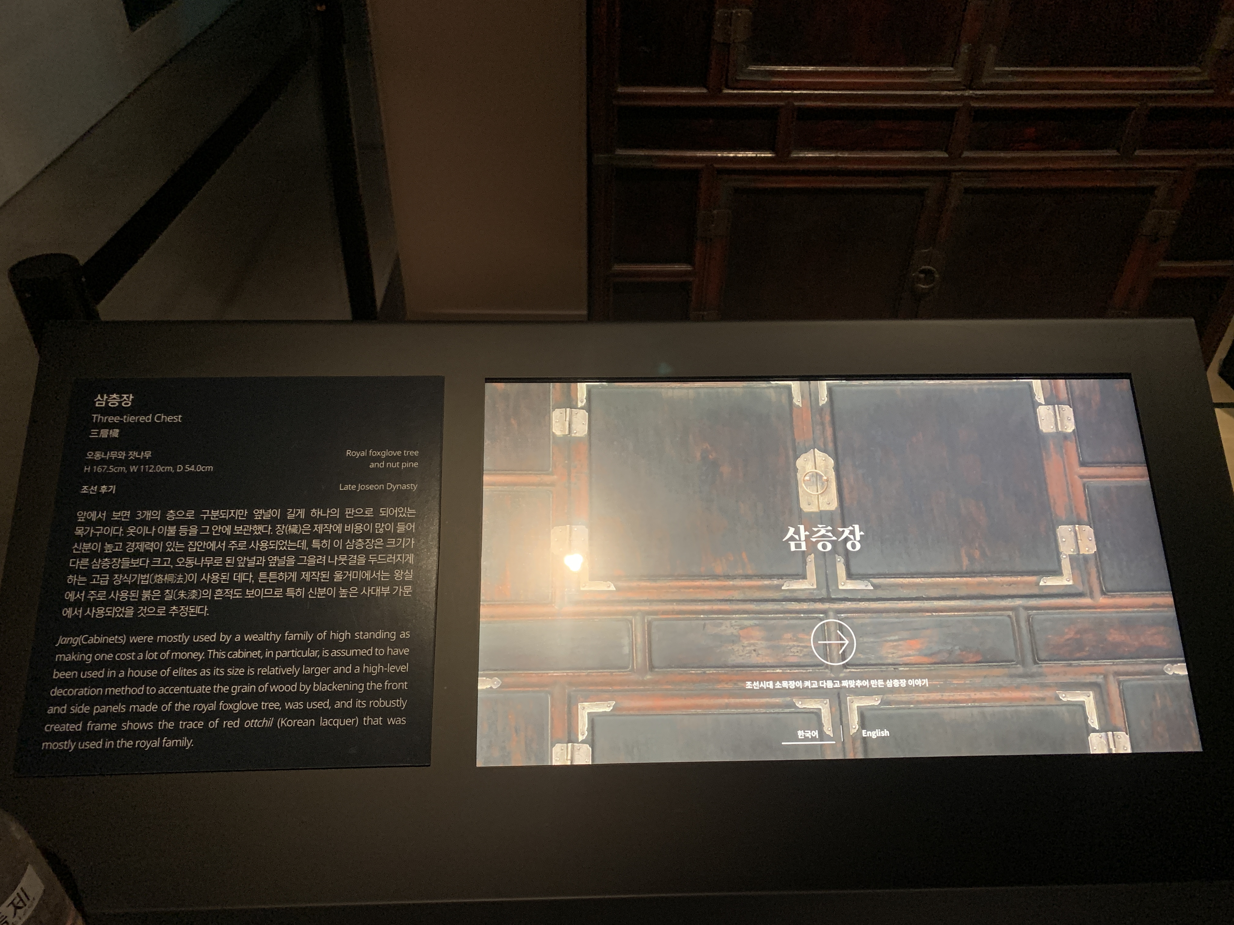 삼층장은 3개의 층으로 구분된 목가구이다. 옷이나 이불 따위를 안에 보관했다. 지금은 장롱이나 장이 흔하고 흔하지만 그 당시에는 제작하는데 비용이 많이 들어서 높은 신분의 계층이나 경제력이 있는 집안에서 사용했다고 한다. 특히 이 전시된 삼층장은 꽤 컸는데 오동나무로 된 앞널(농이나 반닫이의 문짝이 달려 있는 앞면의 널)과 옆널을 그을려서 나뭇결을 두드러지게 하는 고급 장식기법이 사용되었다고 한다. 아마도 사대부 가문에서 사용되었을 것으로 추정하고 있다.