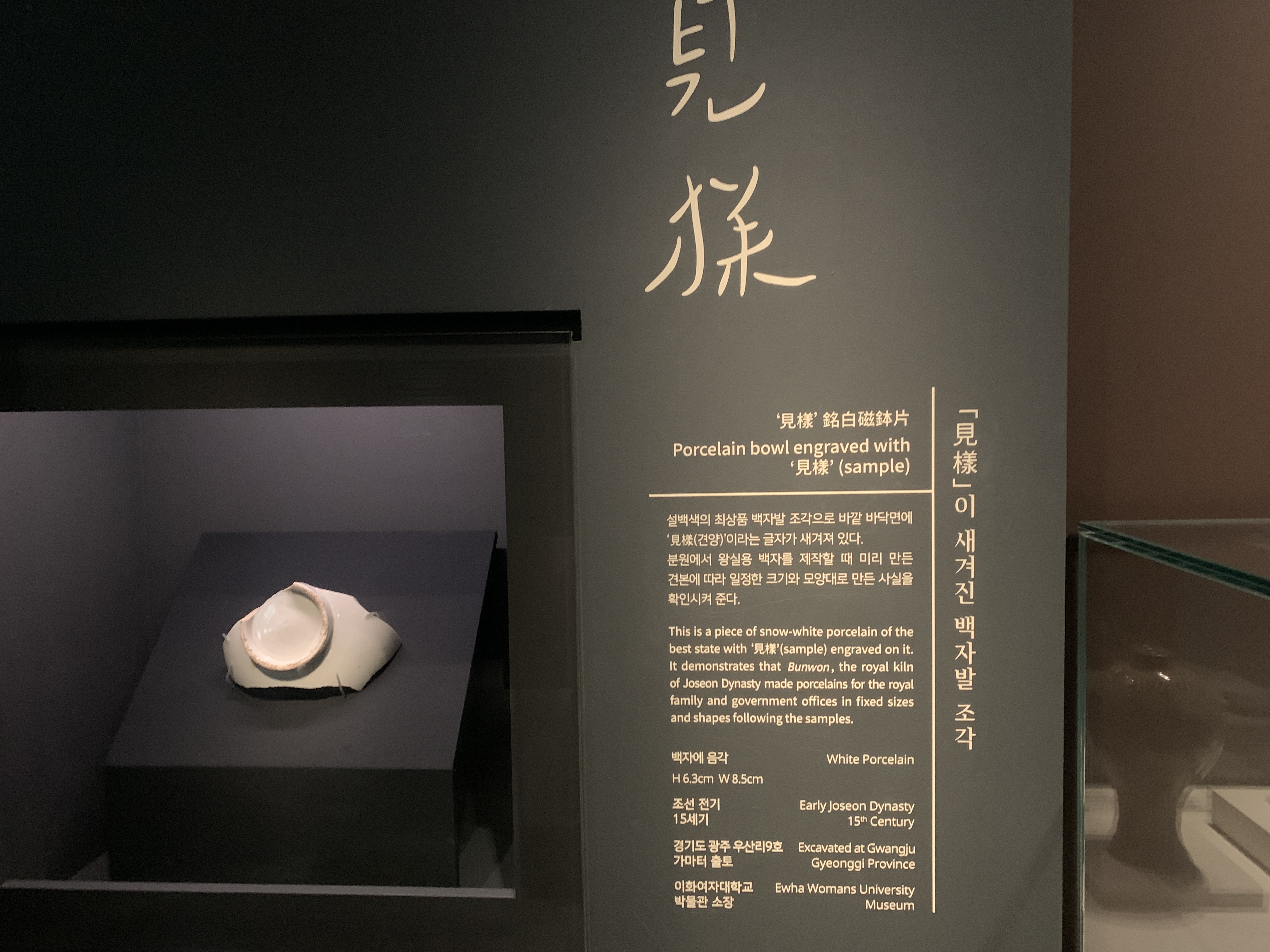 이것은 견양이 새겨진 백자발 조각이다. 바깥 바닥면에 견양이라는 글자가 한자로 새겨져있었다. 왕실용 백자를 제작할 때 미리 만든 견본에 따라 일정한 크기와 모양대로 만들었다는 사실을 알 수 있다. 왕실에서 만드는 그릇에는 표시가 있었다는 것이다.