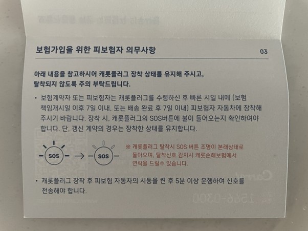 장착된 캐롯 플러그가 운행거리를 측정하고 내가 납입할 보험료를 산정하는 역할을 하기 때문에 탈착되지 않도록 주의해야 합니다. 만약 꽂혔다가 탈착되면 탈착된 기간 동안 1일 500km를 운행한 것으로 간주된다는 무시무시한 주의문구도 적혀 있습니다.