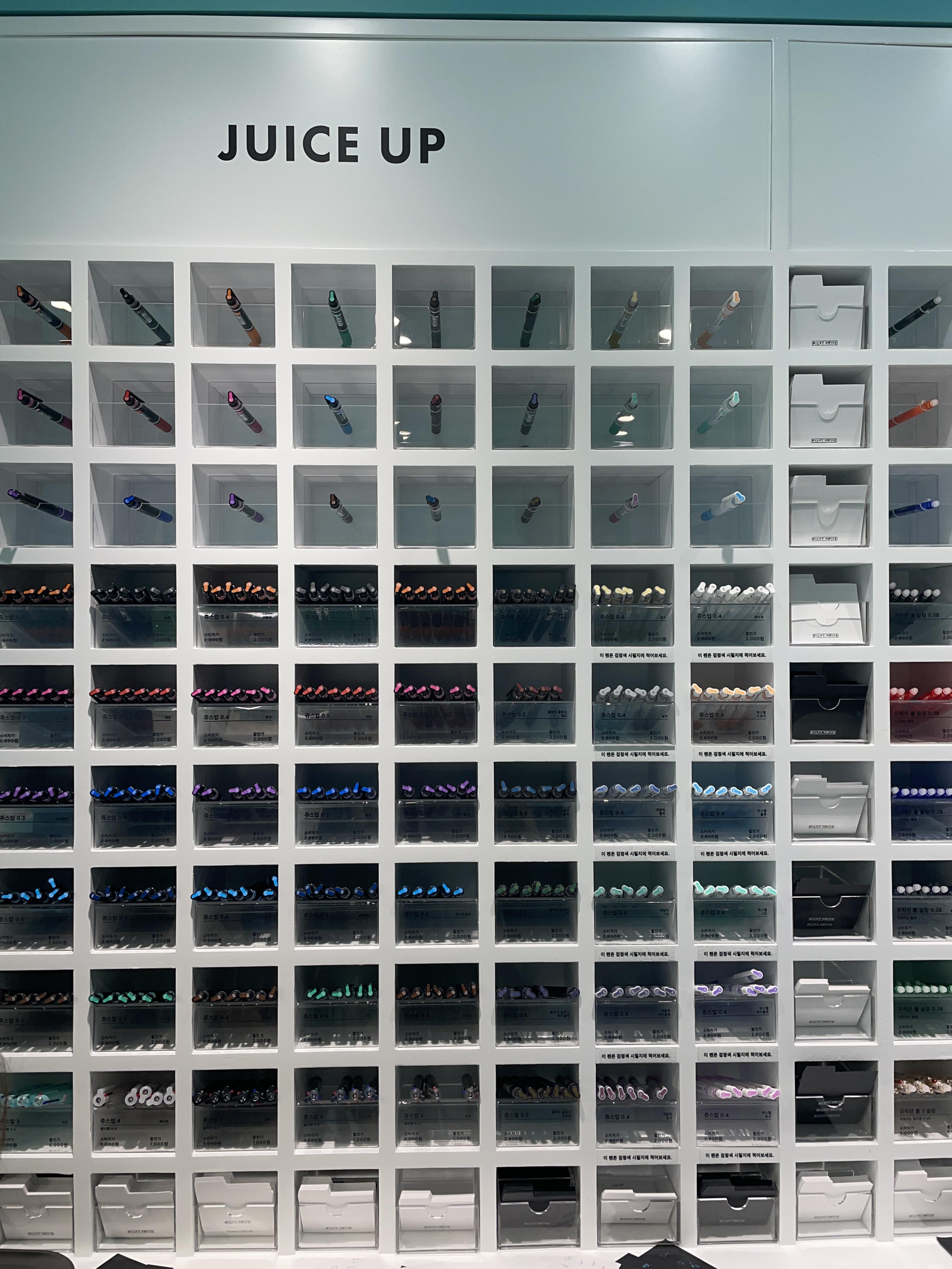 본격적인 펜 코너. JUICE UP은 젤 잉크펜이다. 맨 아래쪽에 메모지에 펜을 테스트해 볼 수 있다.