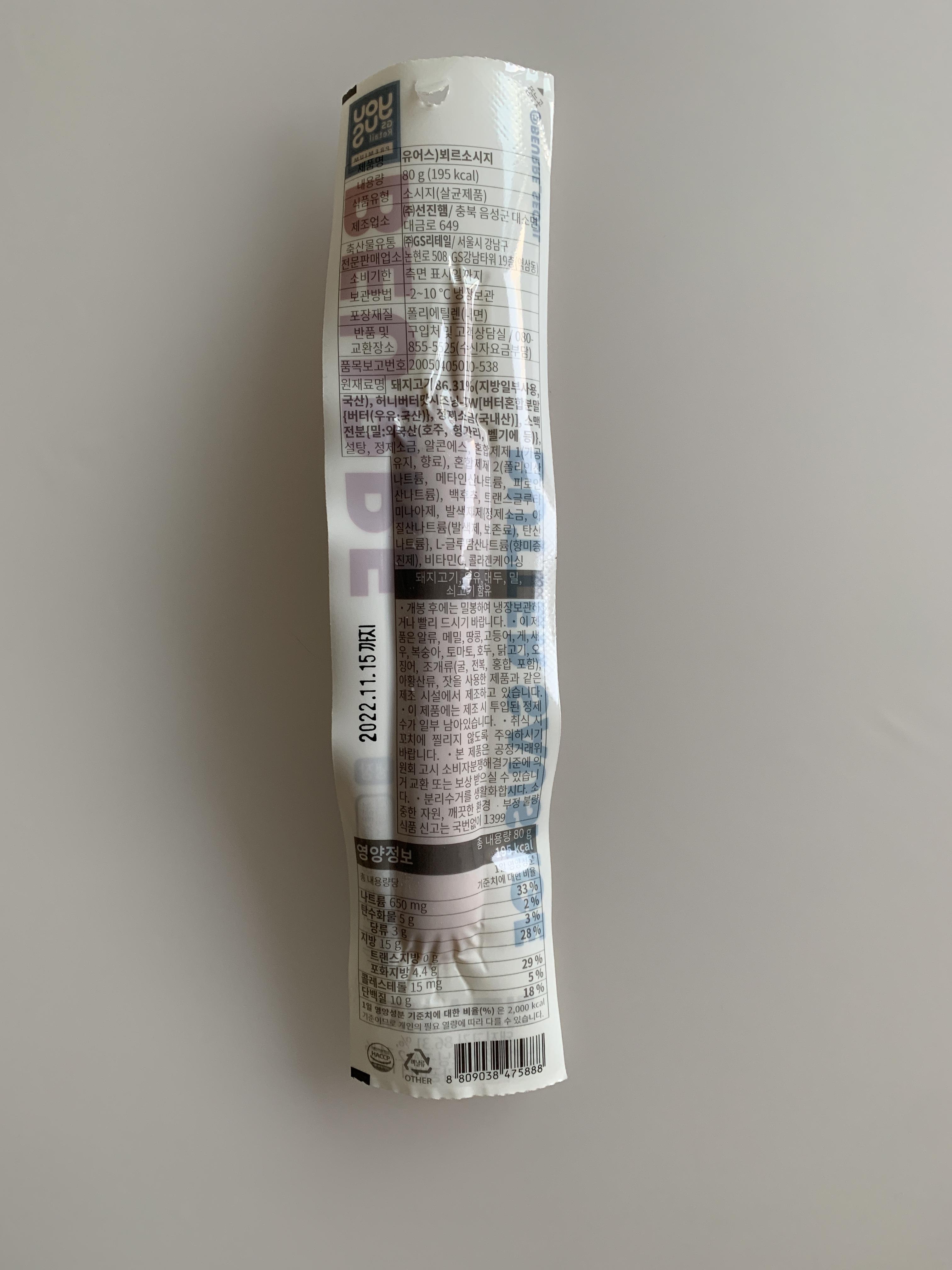 이번에는 뵈르 소시지다. 버터라는 것이 컨셉이다보니 먹었을 때 그 맥주를 마셨을 때 나던 향이 비스무리하게 풍긴다. 그리고 살짝 달콤함이 깔린다. 왜 허니버터라고 했는지 맛보면 깔리는 그 느낌이 있달까. 허니버터 시즈닝이 2.74% 함유되어 있는데 약하게 느껴지는 수준.