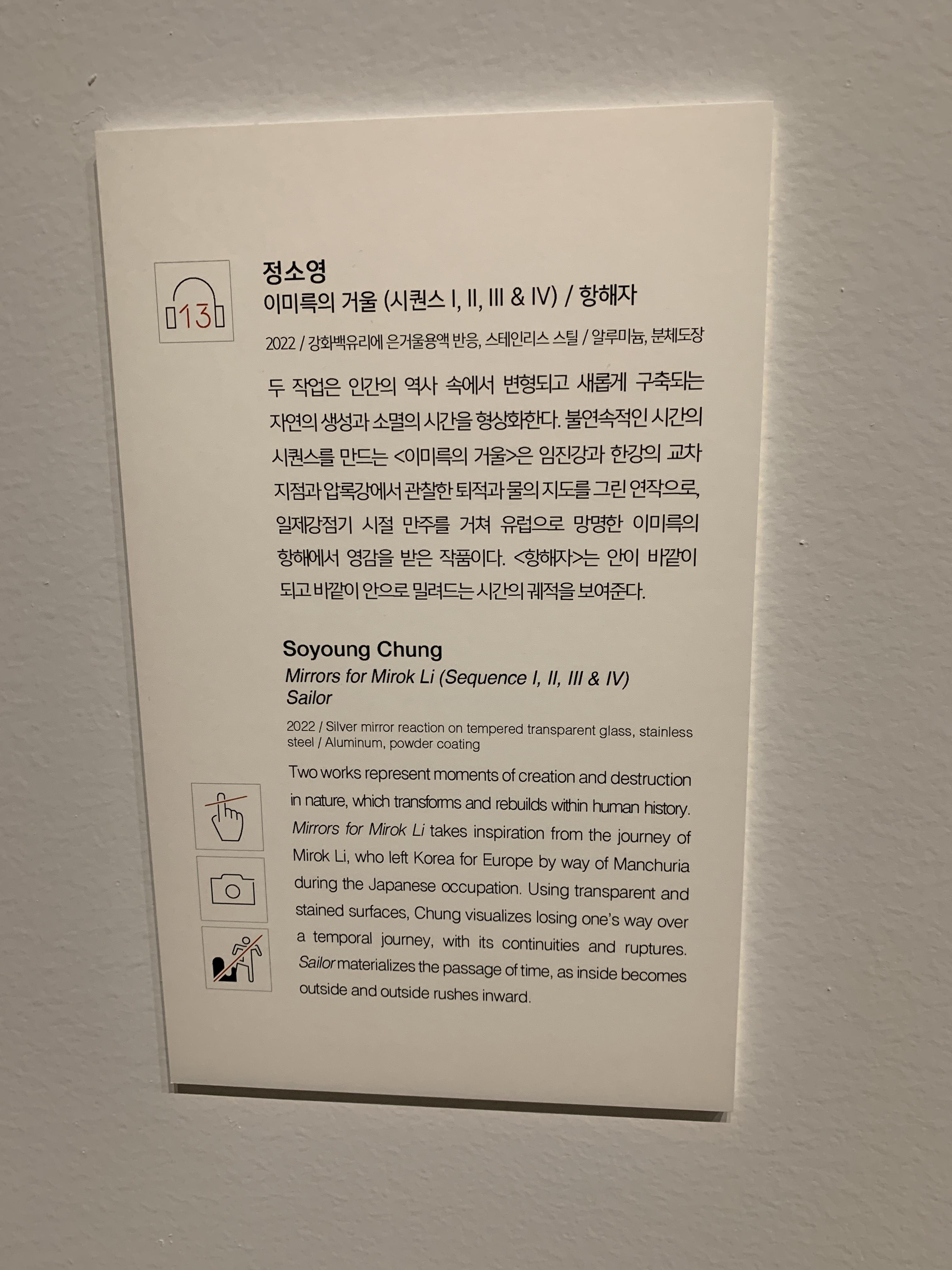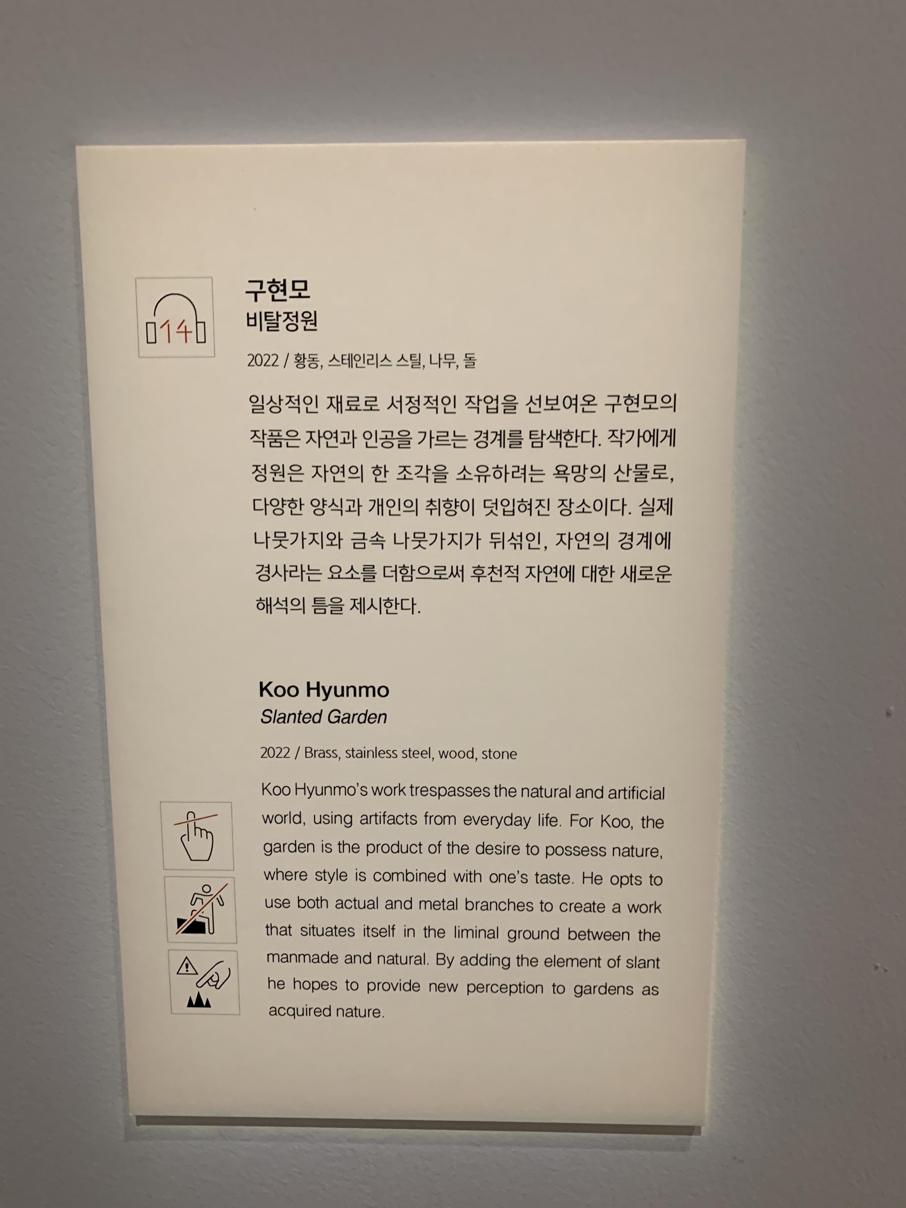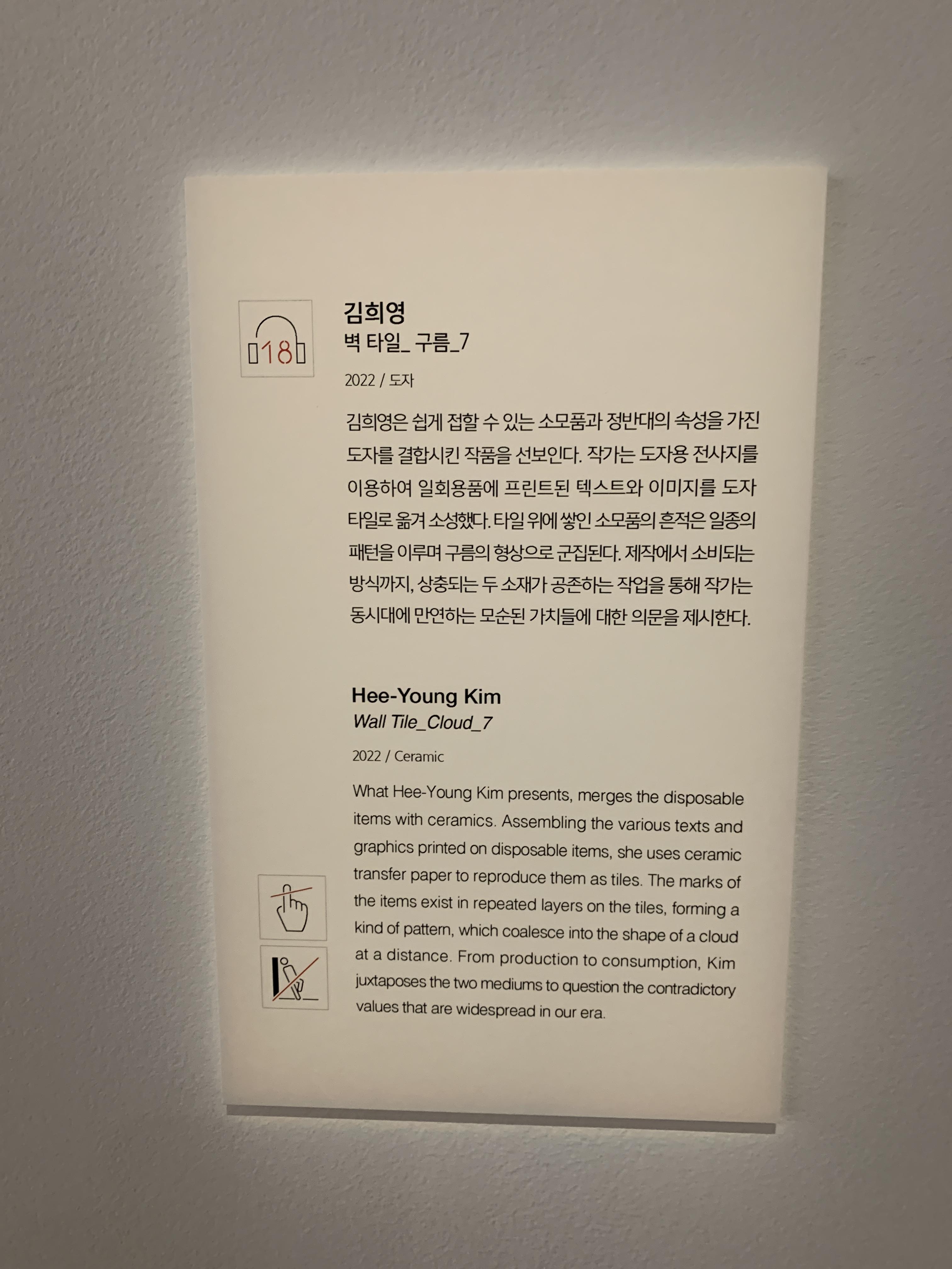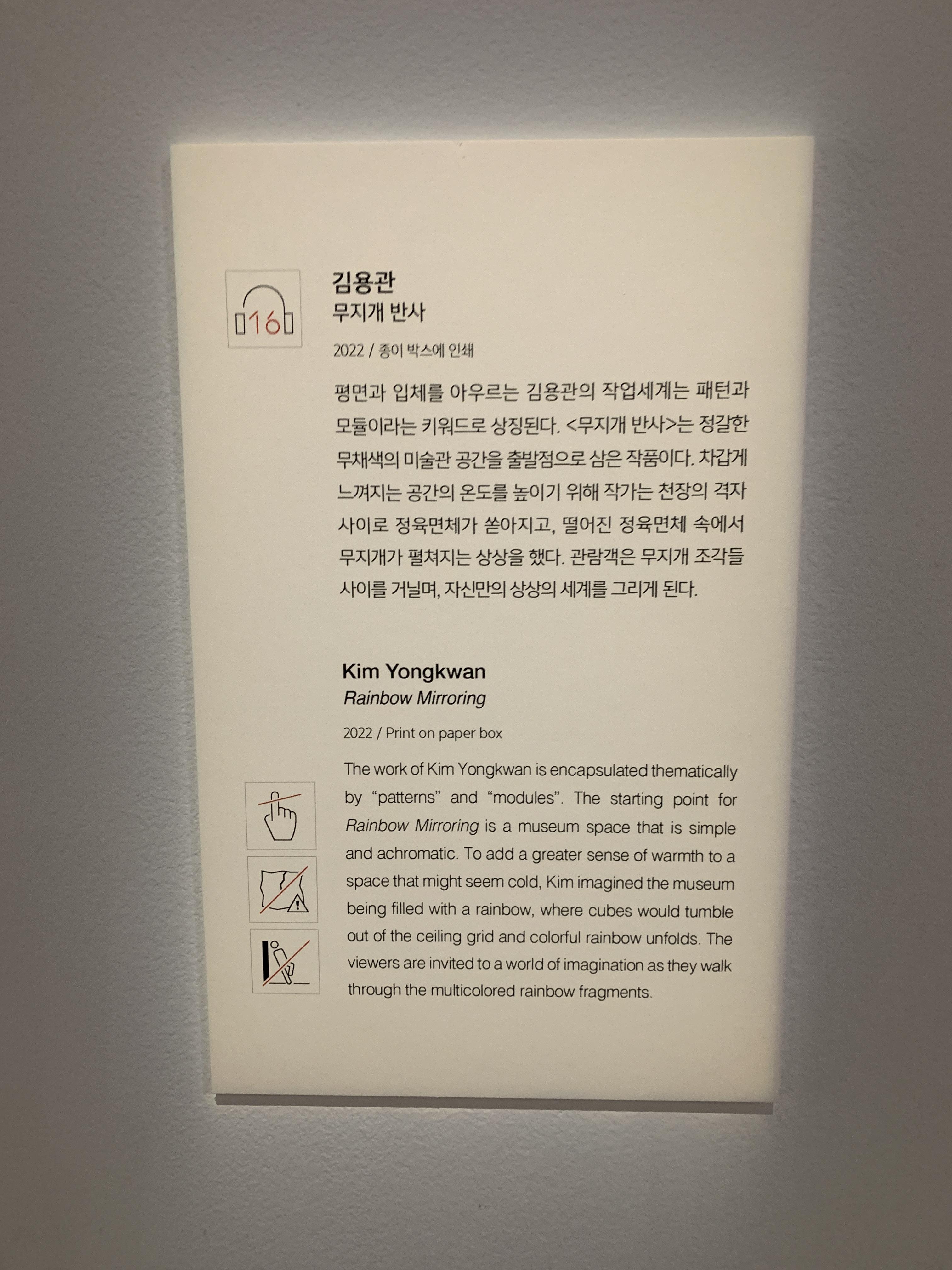 아크릴 소재의 패널들이 겹겹이 쌓여져 있는 작품이었다. 이 작품은 작가가 환경을 대하는 마음을 완전히 바꾸게 되었던 어린 시절의 사건들에서 출발한 것이라고 한다. 기억이 하나의 지점을 통과해 다른 인식으로 전환되고, 결합되는 과정을 표현했다고 쓰여있다. 추상적인 것을 이렇게 가시화시켜 작품으로 표현해내는 것이 참 신비롭고 대단한 듯.