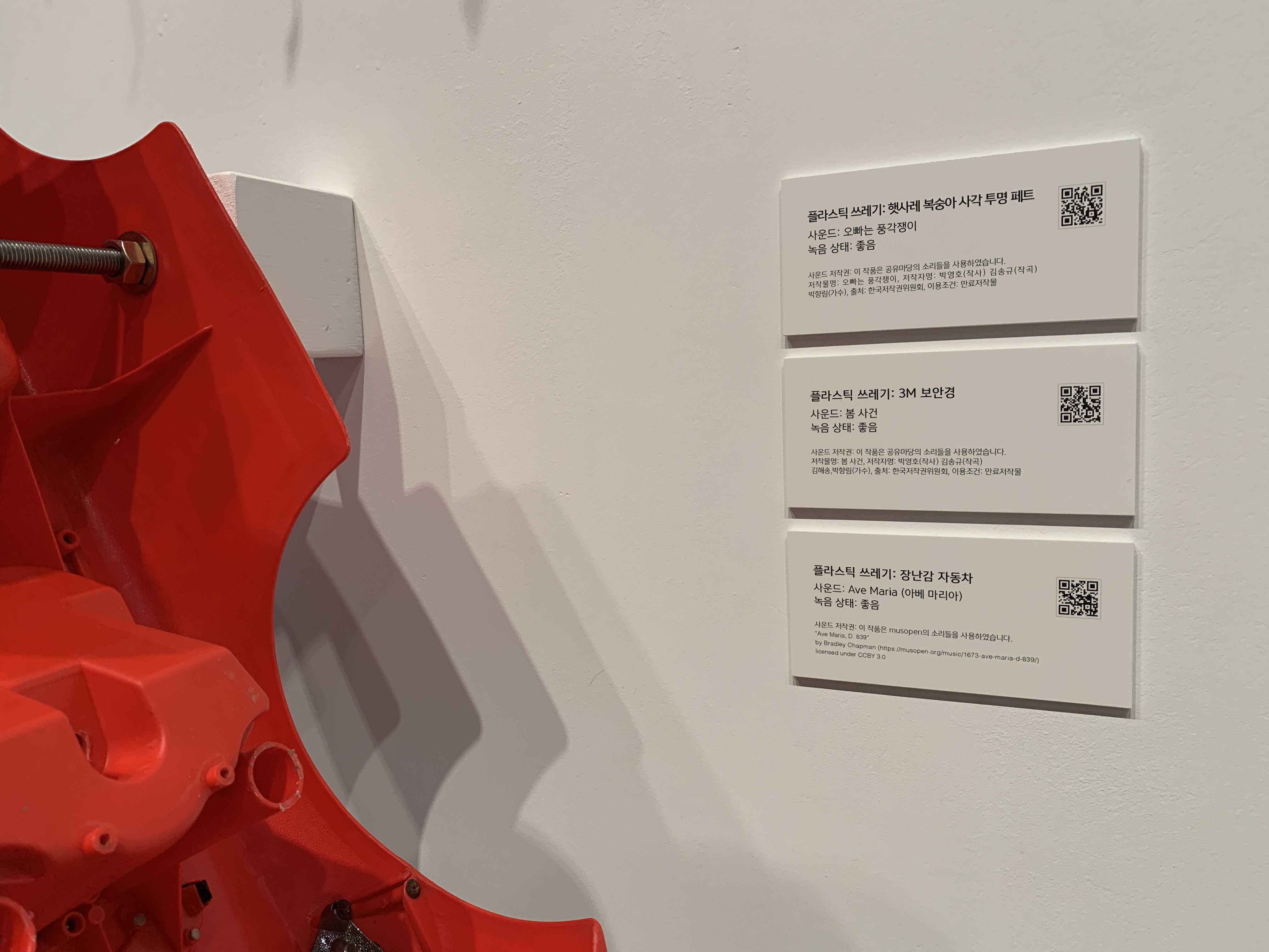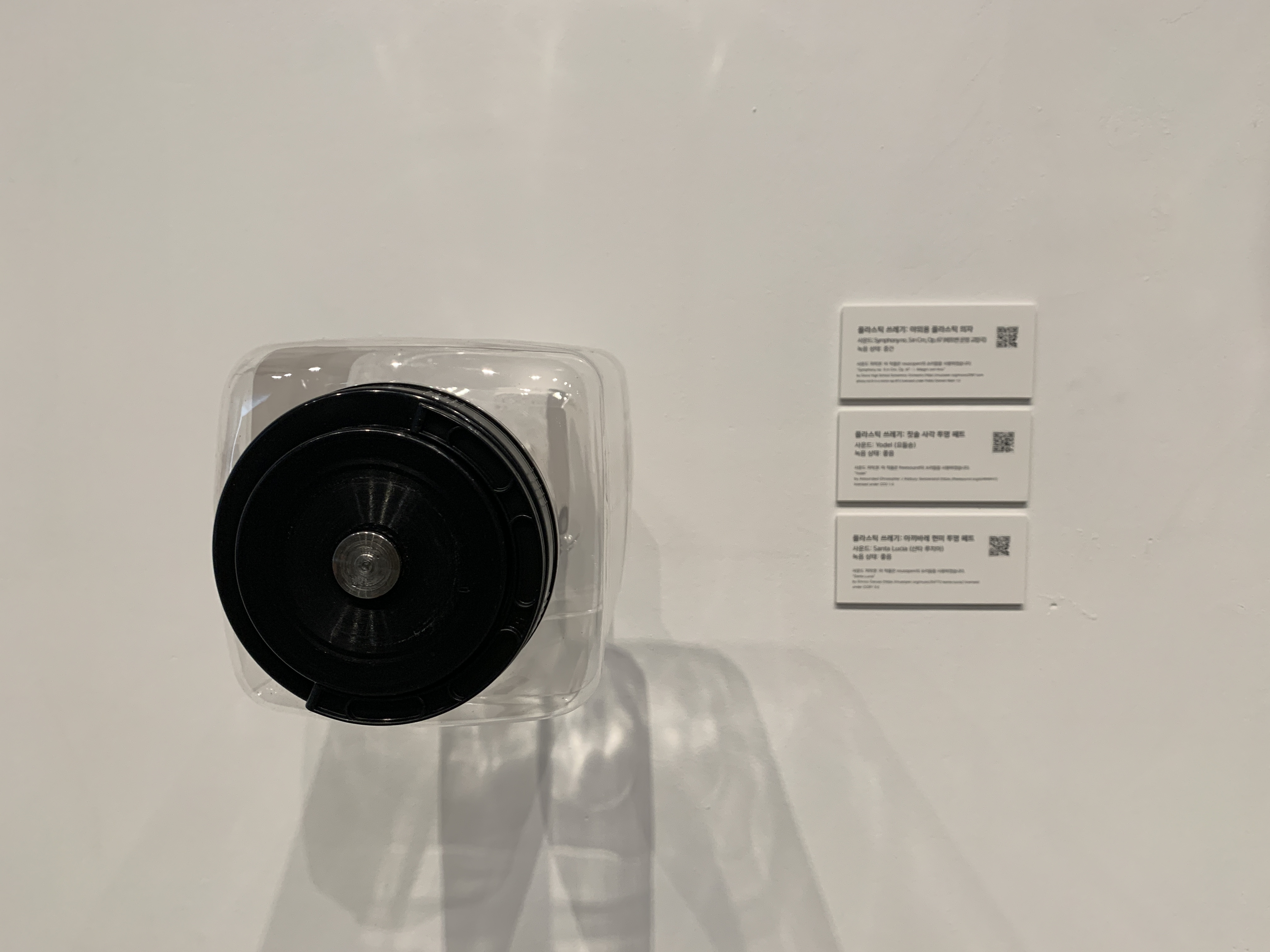 하나 하나의 개별 물거에서도 소리를 들을 수 있도록 만들었는데 일상에서 버려진 플라스틱 쓰레기들이 아주 먼미래에는 어떻게 여겨지고 그때 이 소리를 들으면 어떨지 상상해본다.