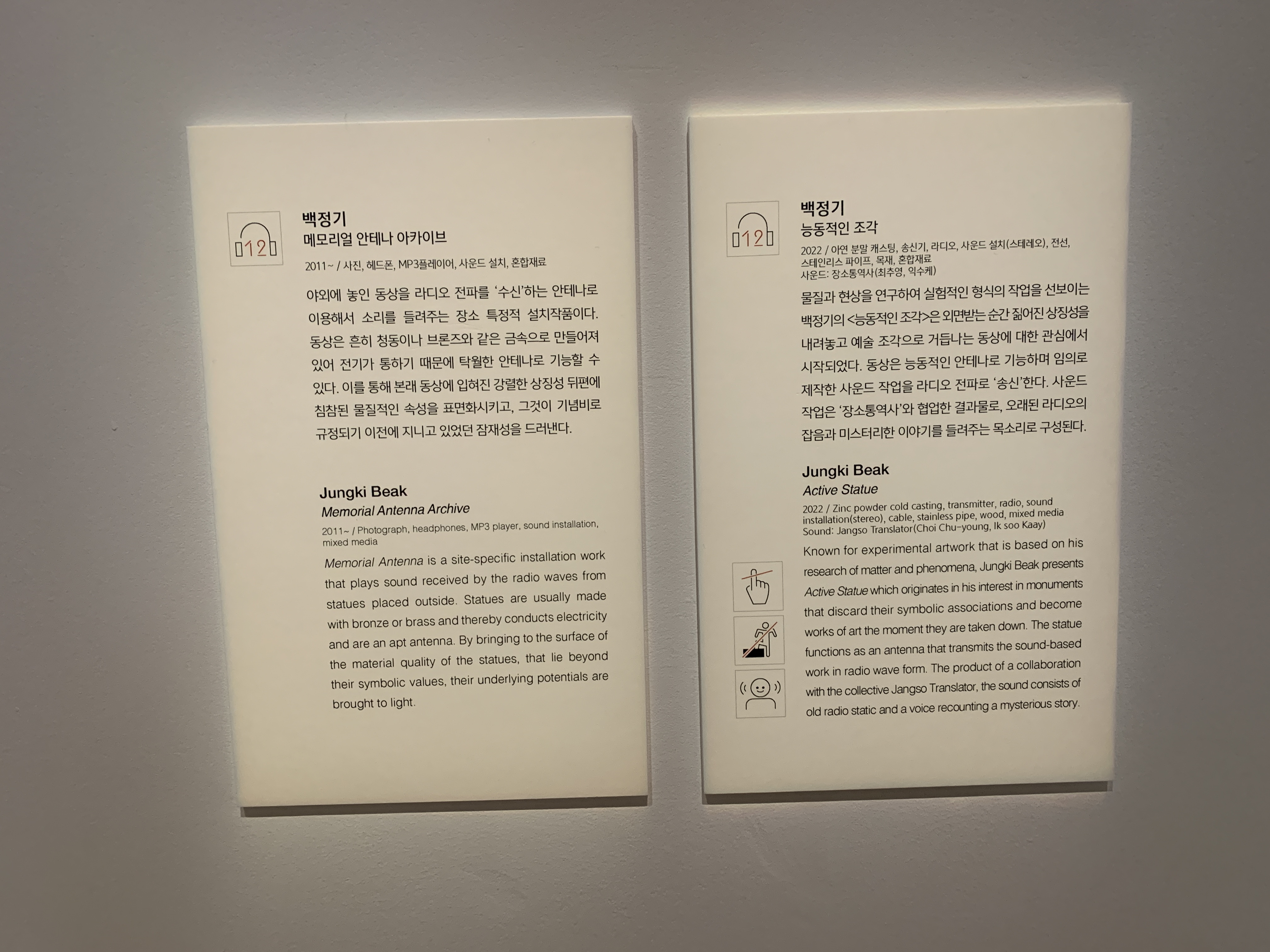 작품 제목에서 능동적이라는 것은 송신용 안테나를 의미하는 것인데 이 동상을 실제로 안테나로 이용하는 것이다. 그래서 소리가 나는 것이 신기했다. 사운드는 라디오의 잡음, 미스테리한 이야기를 들려주는 목소리이다.