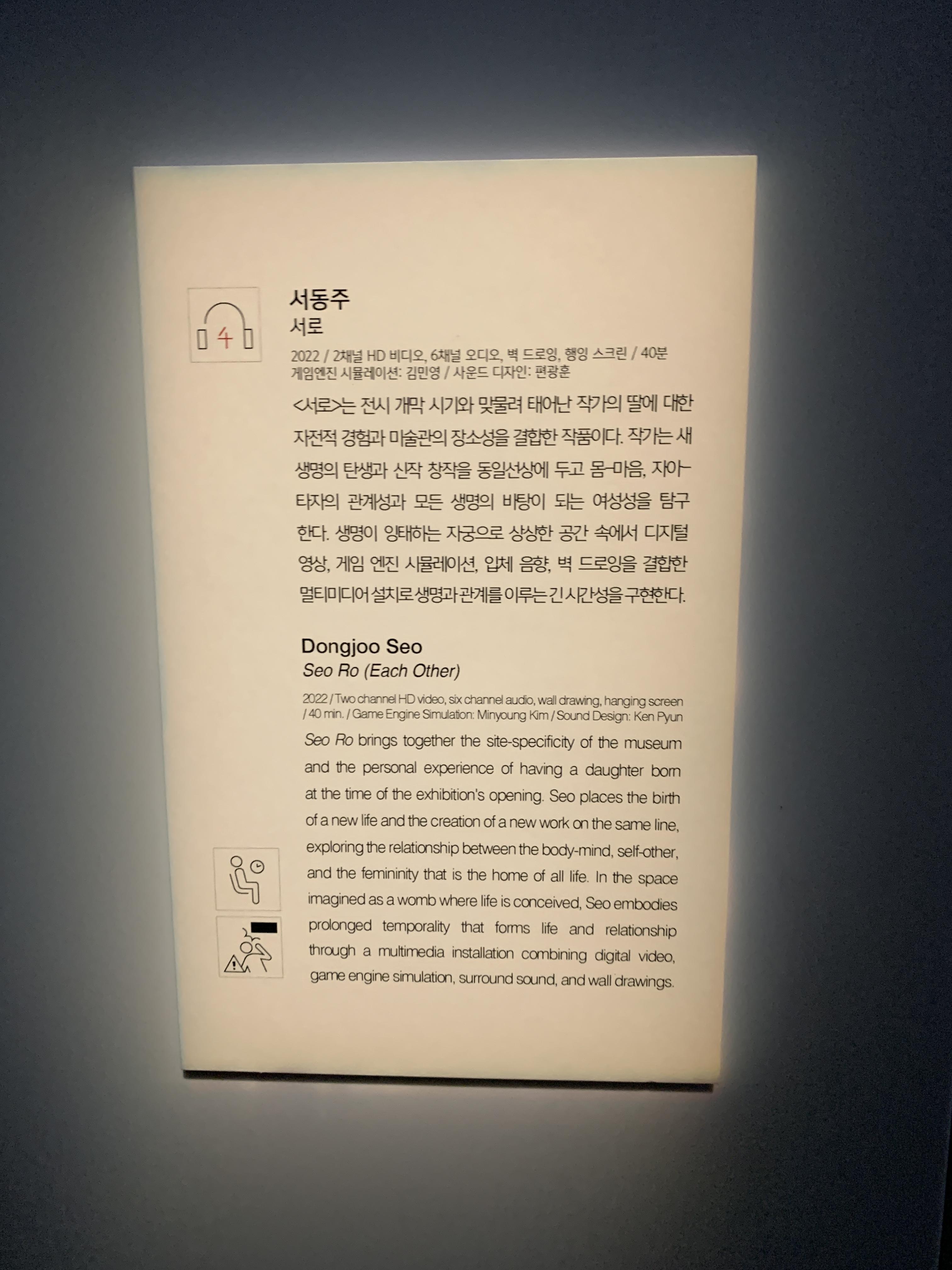 이 영상은 첫 딸에 대한 기억, 미술관의 장소성을 결합한 작품이라고 되어 있었다. 심장 박동소리, 숨소리가 들리고 디지털 영상기법과 게임엔진 시뮬레이션, 입체적 음향공간을 이용한 멀티미디어 등 다양한 것들이 결합된 설치미술.