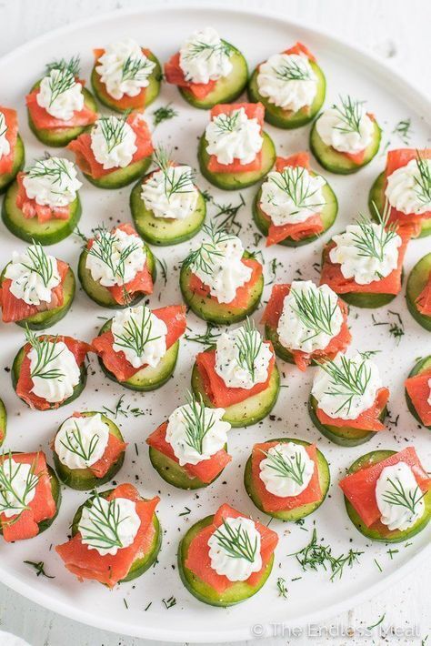 코스트코, 트레이더스 등에서 연어를 많이 구입하는데 핑거푸드 형식으로 세팅하면 여러명이 모였을 때 먹기 편하다. 오이 위에 크림치즈와 홀스레디쉬와 크림치즈를 섞고 케이퍼, 허브(딜)를 올려 세팅한다. 레몬이나 다른 채소들을 얹어도 된다.