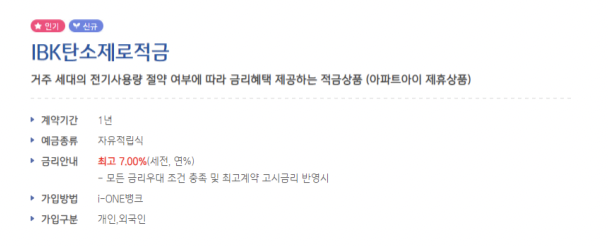| 중소기업은행 | IBK탄소제로적금(자유적립식) | 자유적립식 | 7.00% | 3.00% | 2.54% | 단리 |