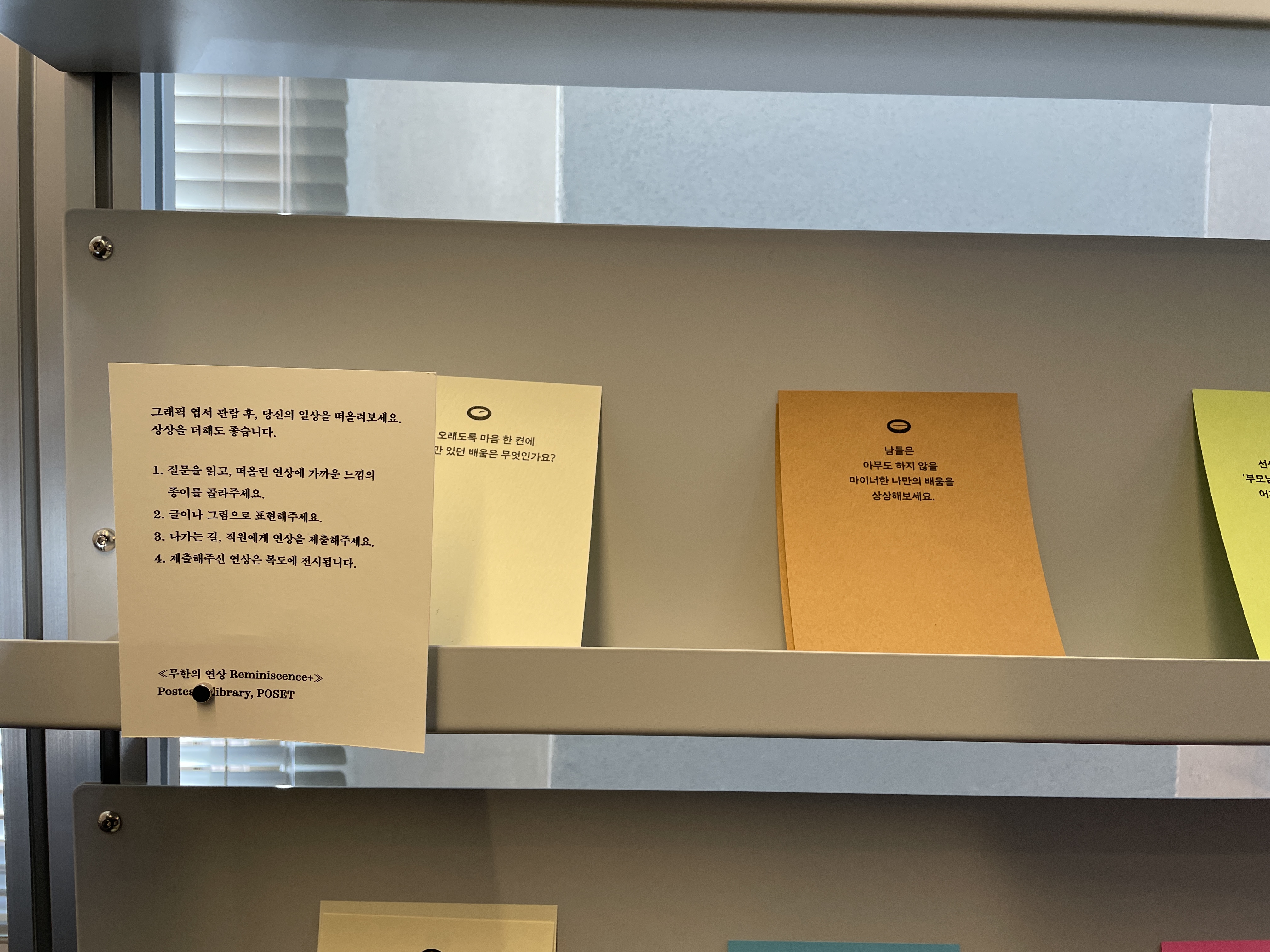 질문은 여기에 있네요. 이 질문지 아래에 자신만의 답을 써보면 됩니다. 글이나 그림으로 표현하면 된데요. 나중에 이 연상은 복도에 전시가 된다고 합니다.