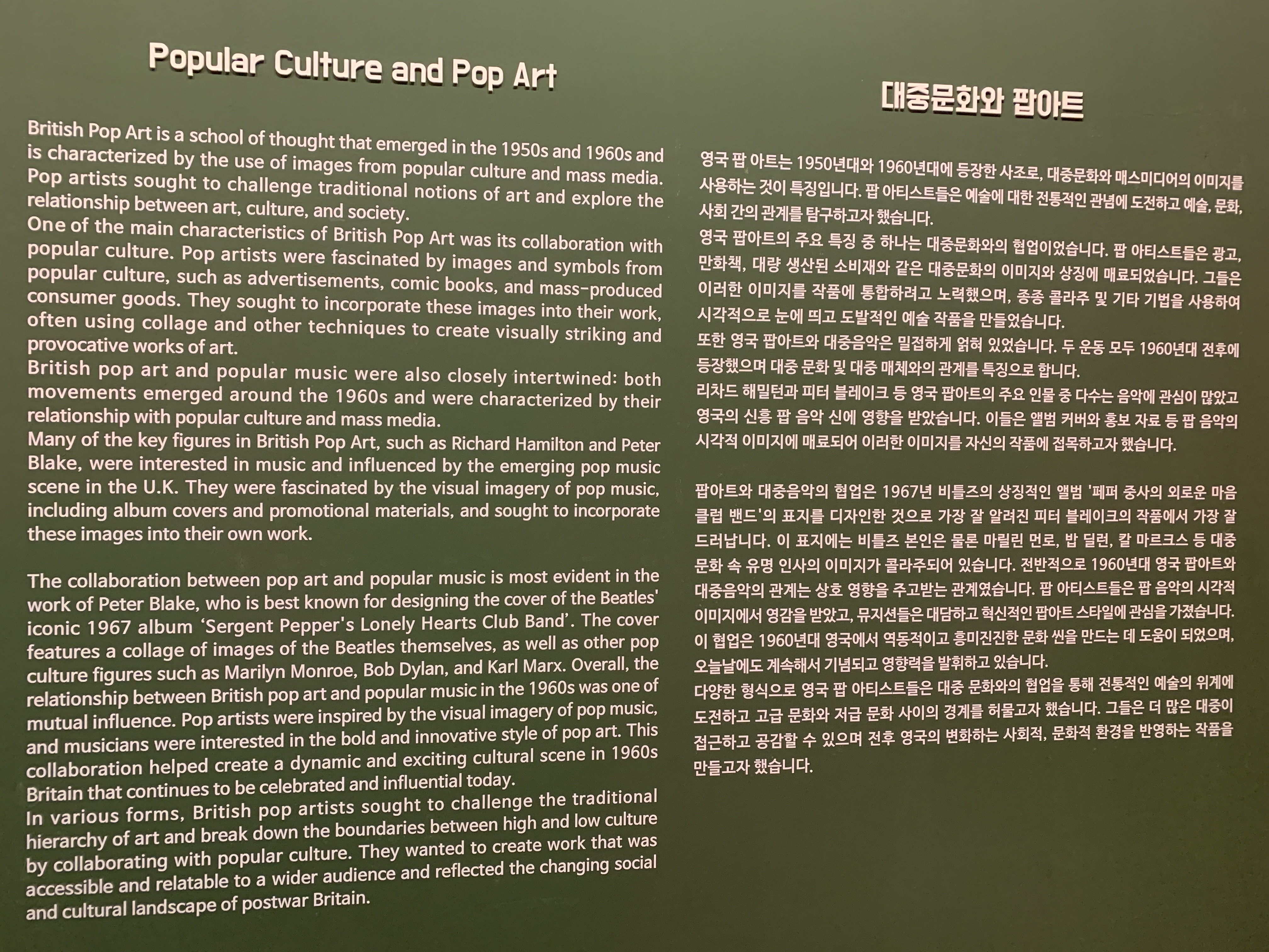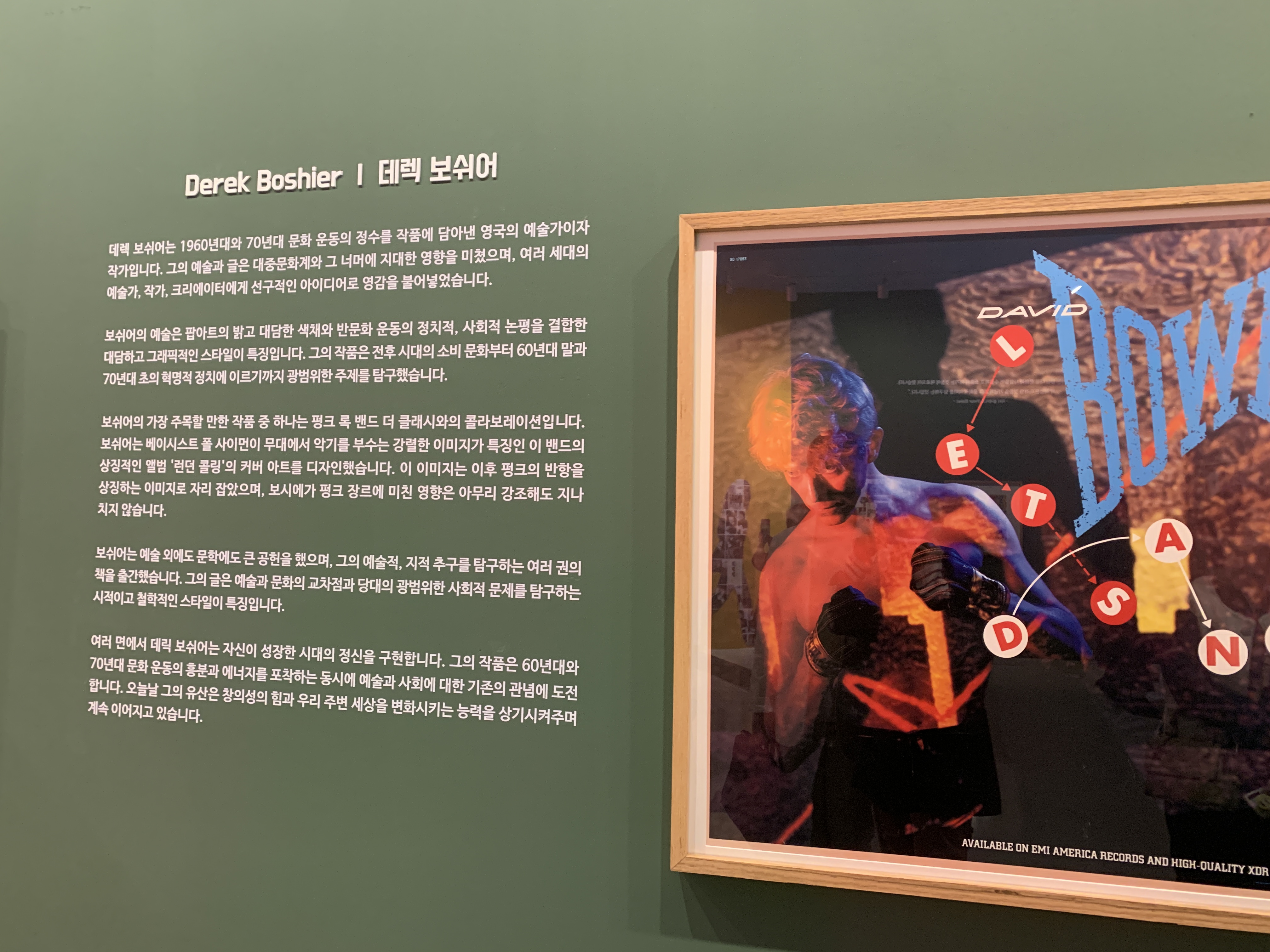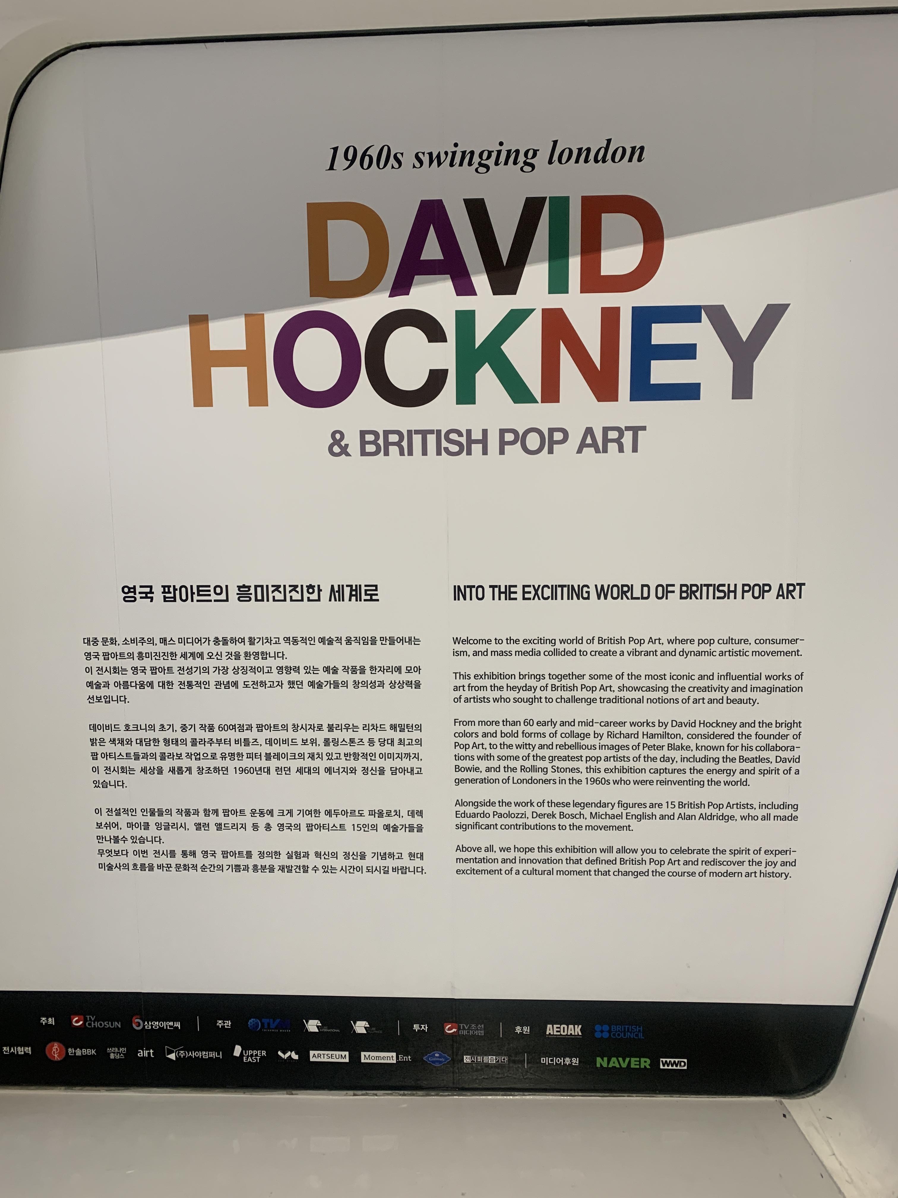 데이비드 호크니의 작품 60점, 리차드 해밀턴, 에두아르도 파올로치, 데렉 보쉬어, 마이클 일글리시, 앨런 엘드리지 등 총 15명의 영국 팝 아티스트들의 작품을 경험할 수 있는 전시회입니다.