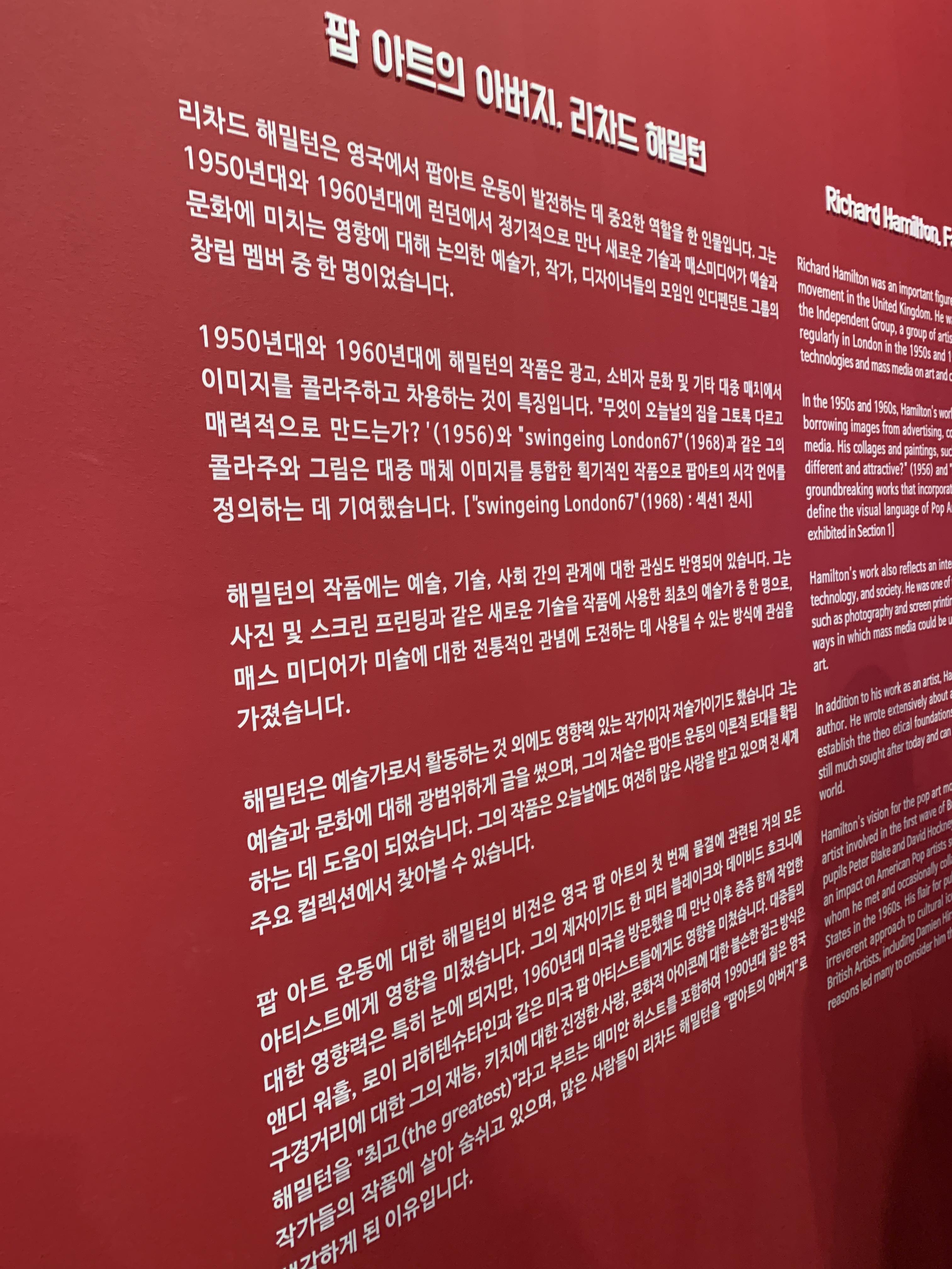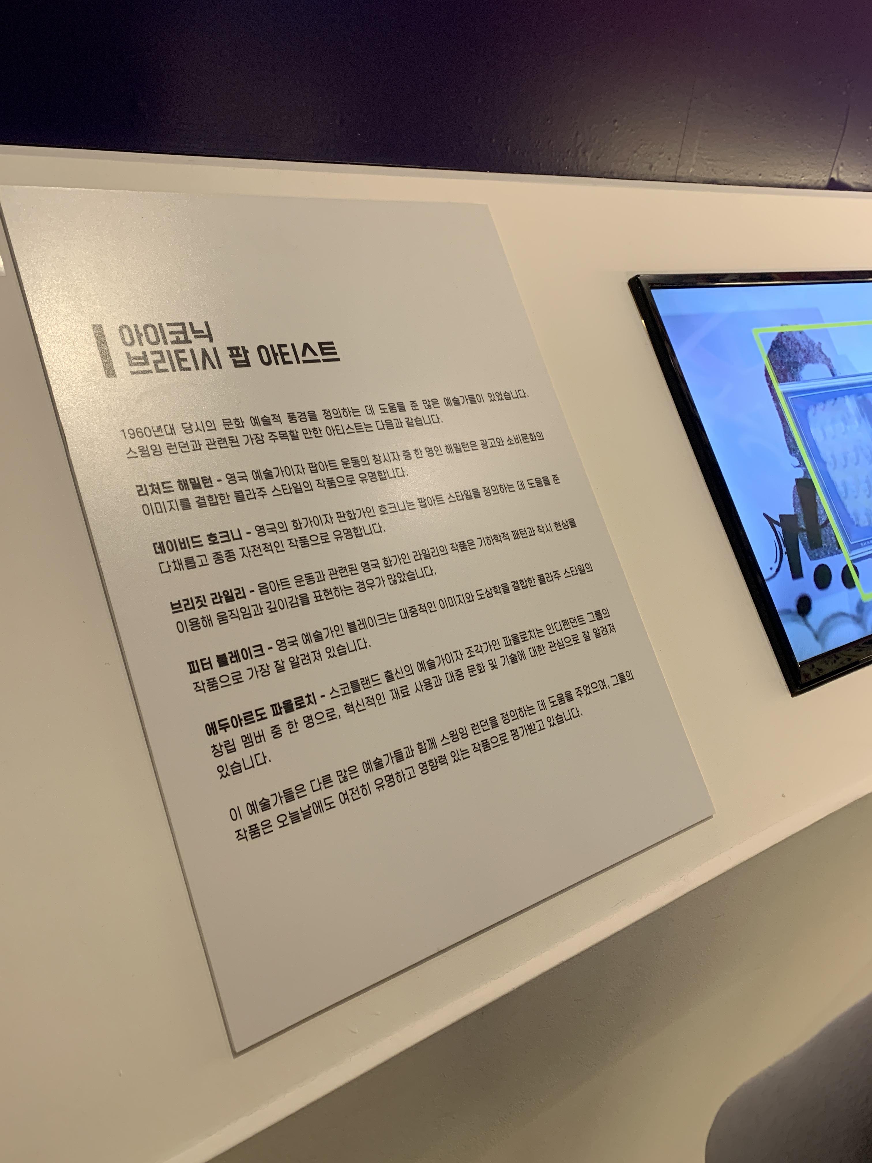 처음에 입장하면 데이비드 호크니 외 다양한 팝 아티스들의 간단한 일대기들을 볼 수 있습니다. 앞으로 보게 될 전시 작품들의 작가들이니 한번 씩 읽으면서 눈에 넣어두면 좋습니다.