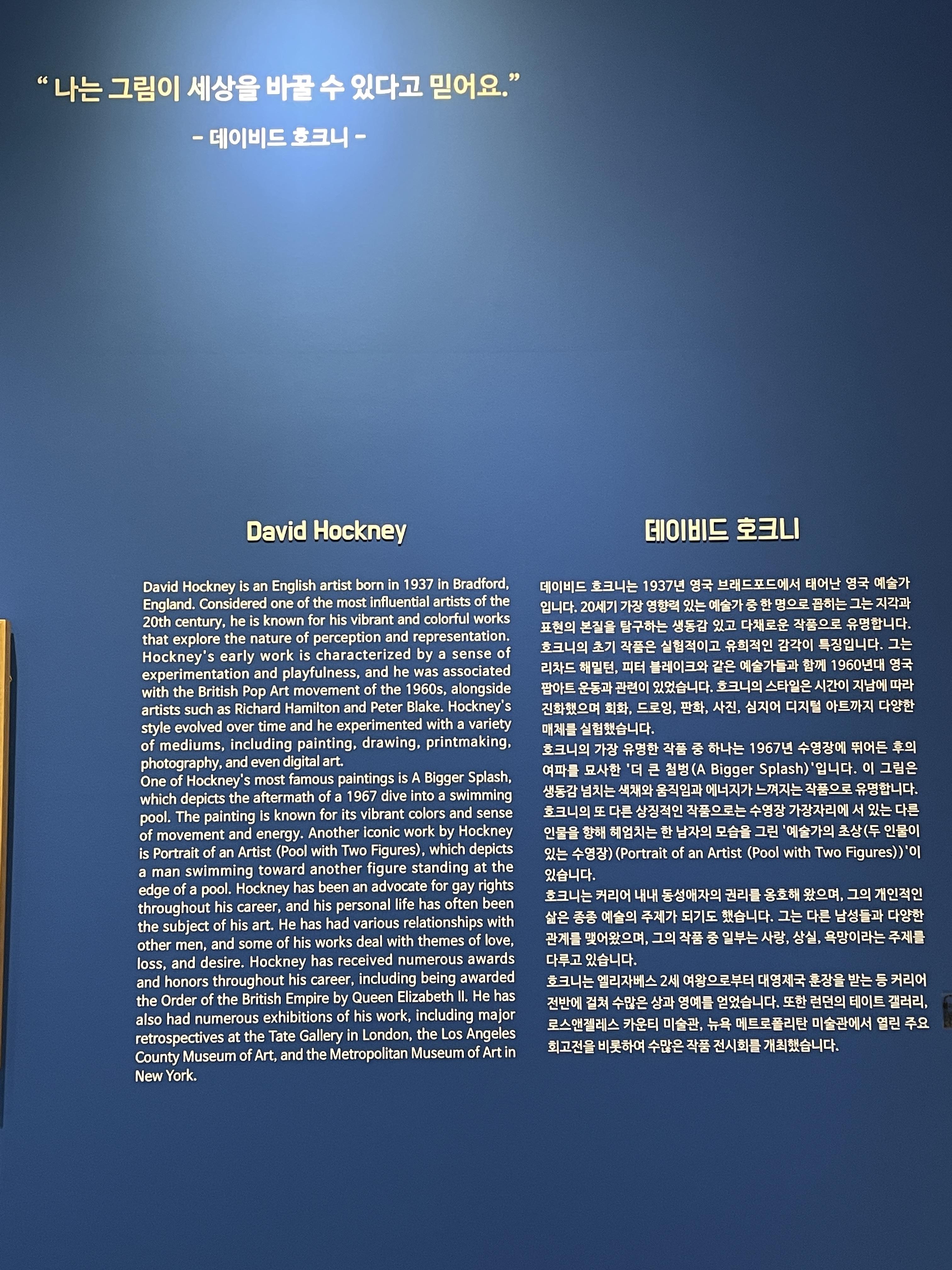 여유가 된다면 데이비드 호크니라는 사람과 작품에 대한 책이 있는데 읽어보고 전시를 보신다면 더욱 풍성한 관람이 되지 않을까 싶습니다.