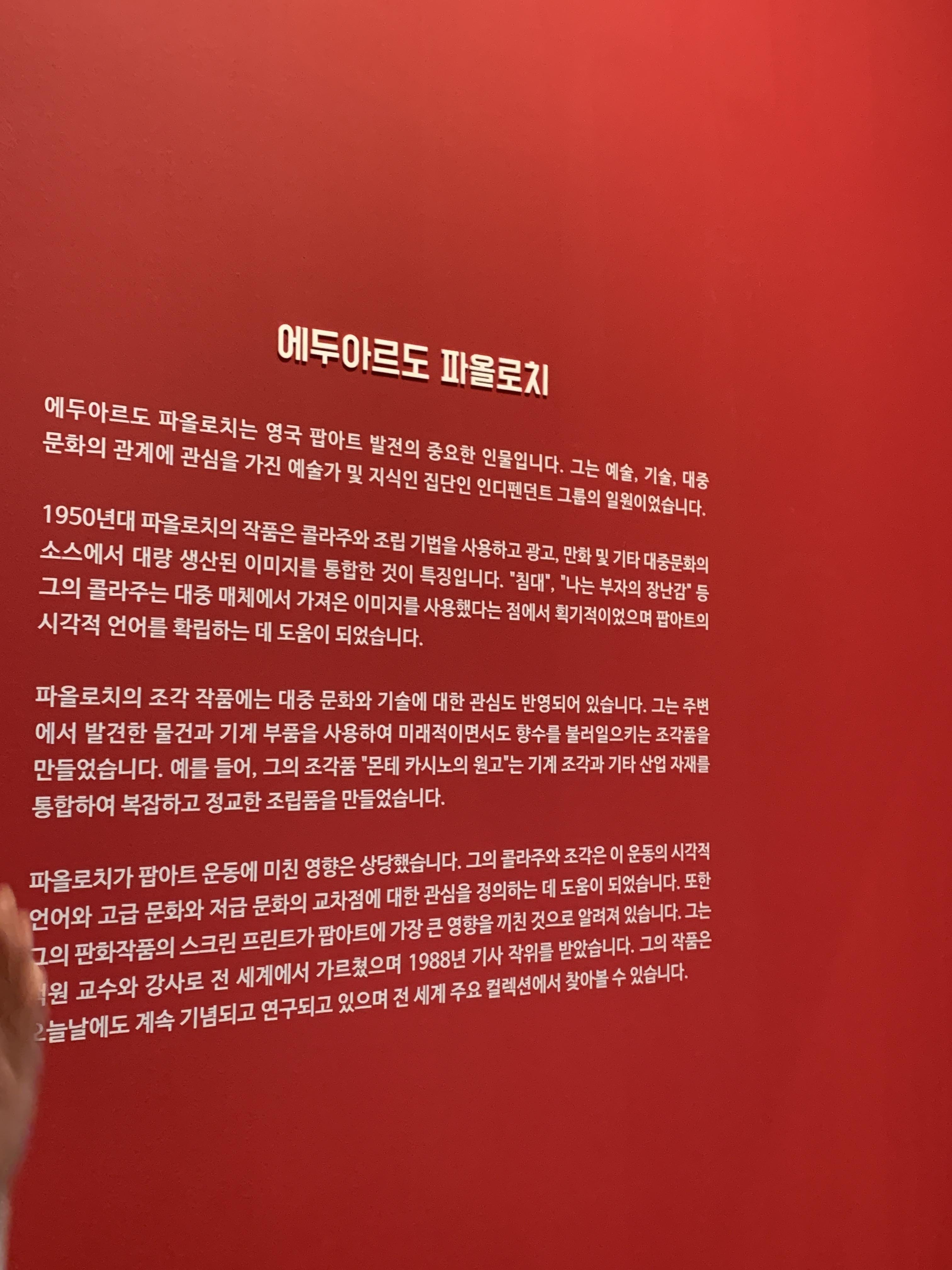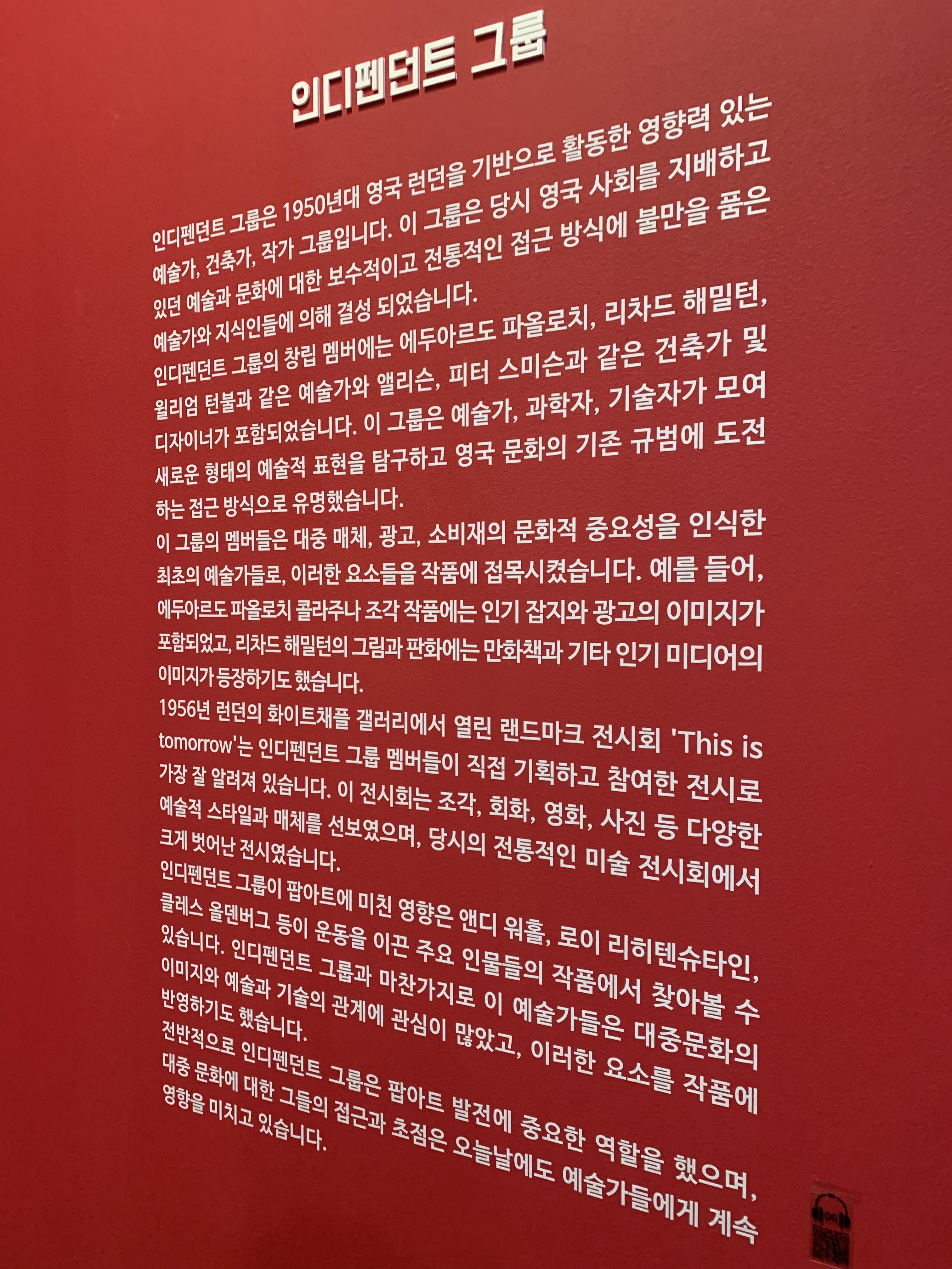 인디펜던트 그룹은 1950년대 영국 런던 기반으로 활동한 영향력 있는 건축가, 예술가, 작가 그룹을 말합니다. 이 멤버들이 대중 매체, 광고, 소비재의 문화적 중요성을 인식한 최초의 예술가들이며 팝아트 발전에도 중요한 역할을 했기 때문에 이 사람들의 작품을 보는 것은 팝아트 작품을 보는데에 또 다른 재미와 공부가 됩니다.