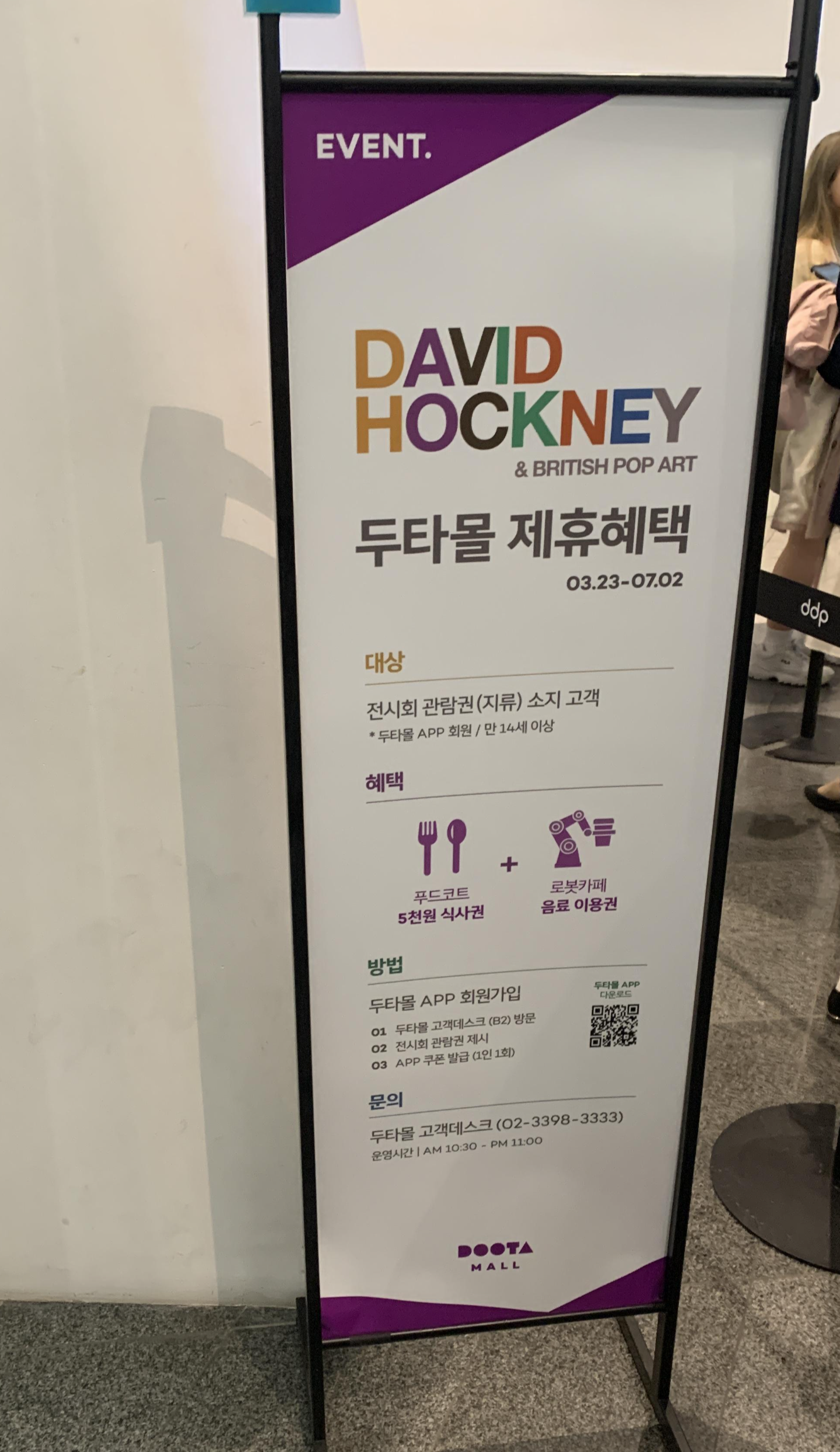 한국 영국 140주년 기념으로 동대문 디자인 플라자 DDP에서 열리는 데이비드 호크니 전시회에 다녀왔습니다. 사실 데이비드 호크니 전시라고 하지만 호크니 작품만 전시 되어 있는 것은 아니고, 영국의 팝아트 작가들의 작품이 함께 전시되어 있습니다. 전시는 M1이라는 곳으로 입장하여 발권을 받아야 합니다. 주차는 DDP 내 주차장에 하면 2만원 이상 구매 시, 1시간 무료 / 5만원 이상 구매 시, 2시간 무료입니다. 네이버 예매를 해도 가능합니다. 매표소에서 주차 할인 등록이 가능하니 참고하세요!