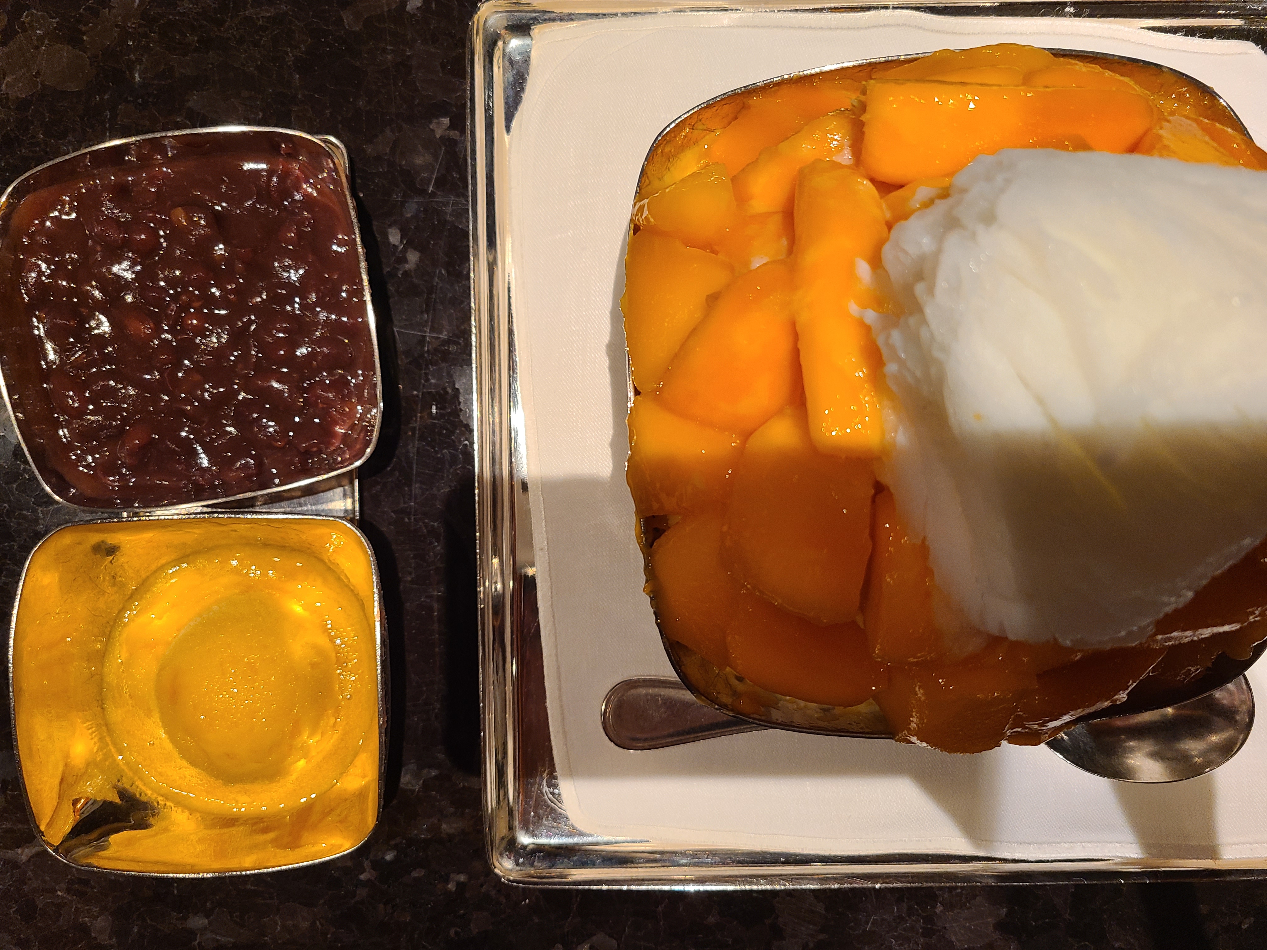 이게 작아 보이는데, 망고가 많고 꽉꽉 들어차 있어서, 식후에 먹으면 양이 꽤 많다. 7명이 두 개를 시켰는데 꽤 많이 남겼다. 망고도 맛있고, 빙결도 훌륭한데 다들 배가 불렀나 보다.