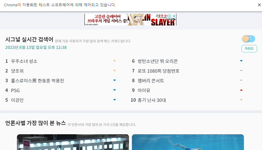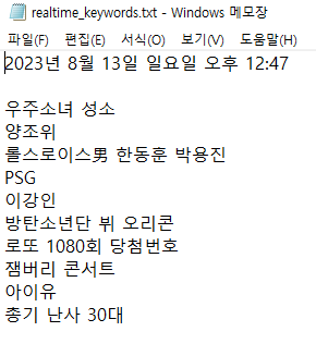 data = ['2023년 8월 13일 일요일 오후 12:47', '', '우주소녀 성소', '양조위', '롤스로이스男 한동훈 박용진', 'PSG', '이강인', '방탄소년단 뷔 오리콘', '로또 1080회 당첨번호', '잼버리 콘서트', '아이유', '총기 난사 30대']
