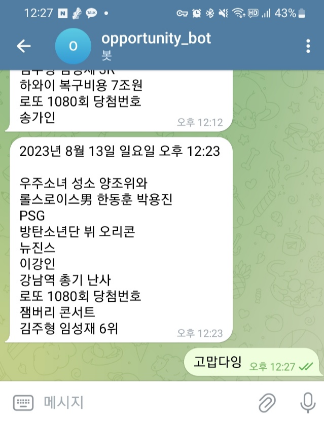 다음 포스팅에서는 이 메시지를 텔레그램 봇이 발송하도록 하는 작업을 설명하겠습니다.