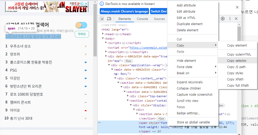 ▲ 10개의 실시간 키워드는 CSS SELECTOR가 모두 다르더군요. 하지만 어떤 규칙성이 있어서 그걸 토대로 for loop 구문으로 코드 작성했습니다.