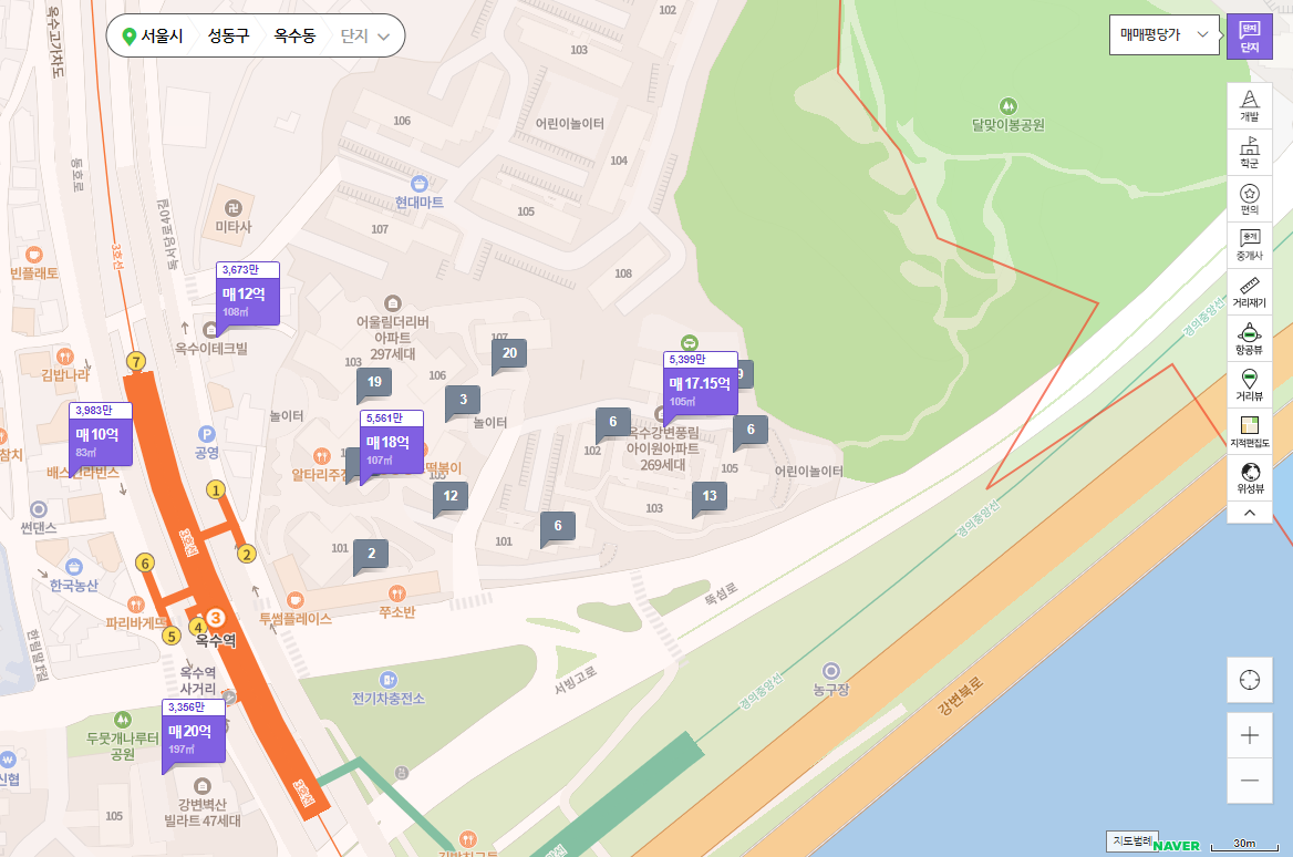 이번 임장의 구체적인 경로는, 옥수역노상공영주차장에 차를 주차하고 옥수 어울림 - 옥수 강변풍림아이원 - 옥수동 삼성아파트 - 래미안옥수리버젠 - 브라운스톤 - e편한세상 옥수파크힐스 - 금호동 스타벅스까지 걸었다.