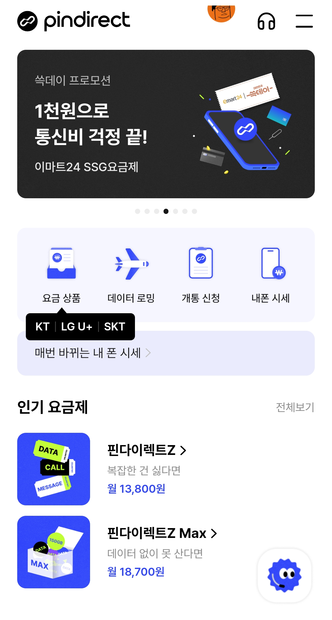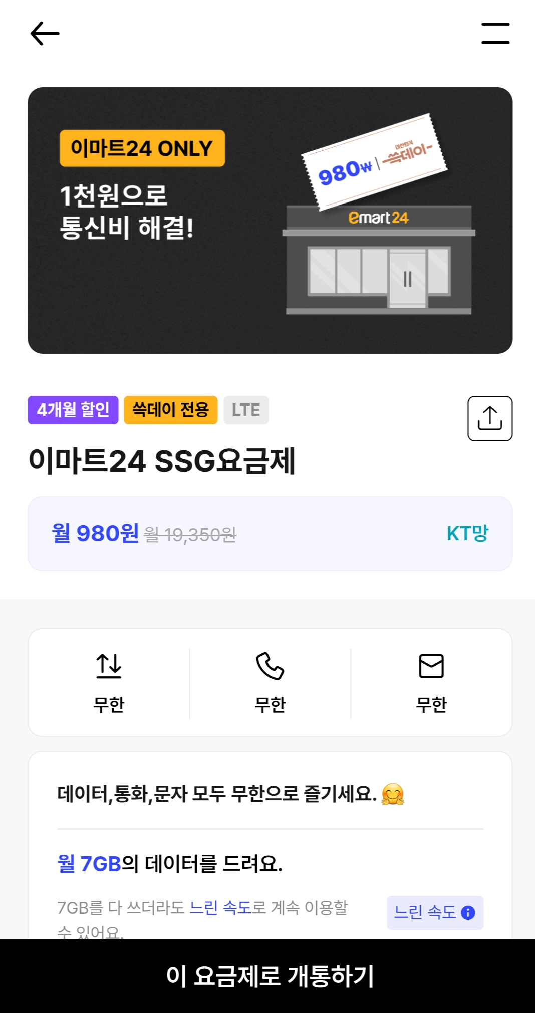 이 유심으로 핀다이렉트의 이마트24 SSG요금제에 가입하면 한 달 통신비가 980원이다.