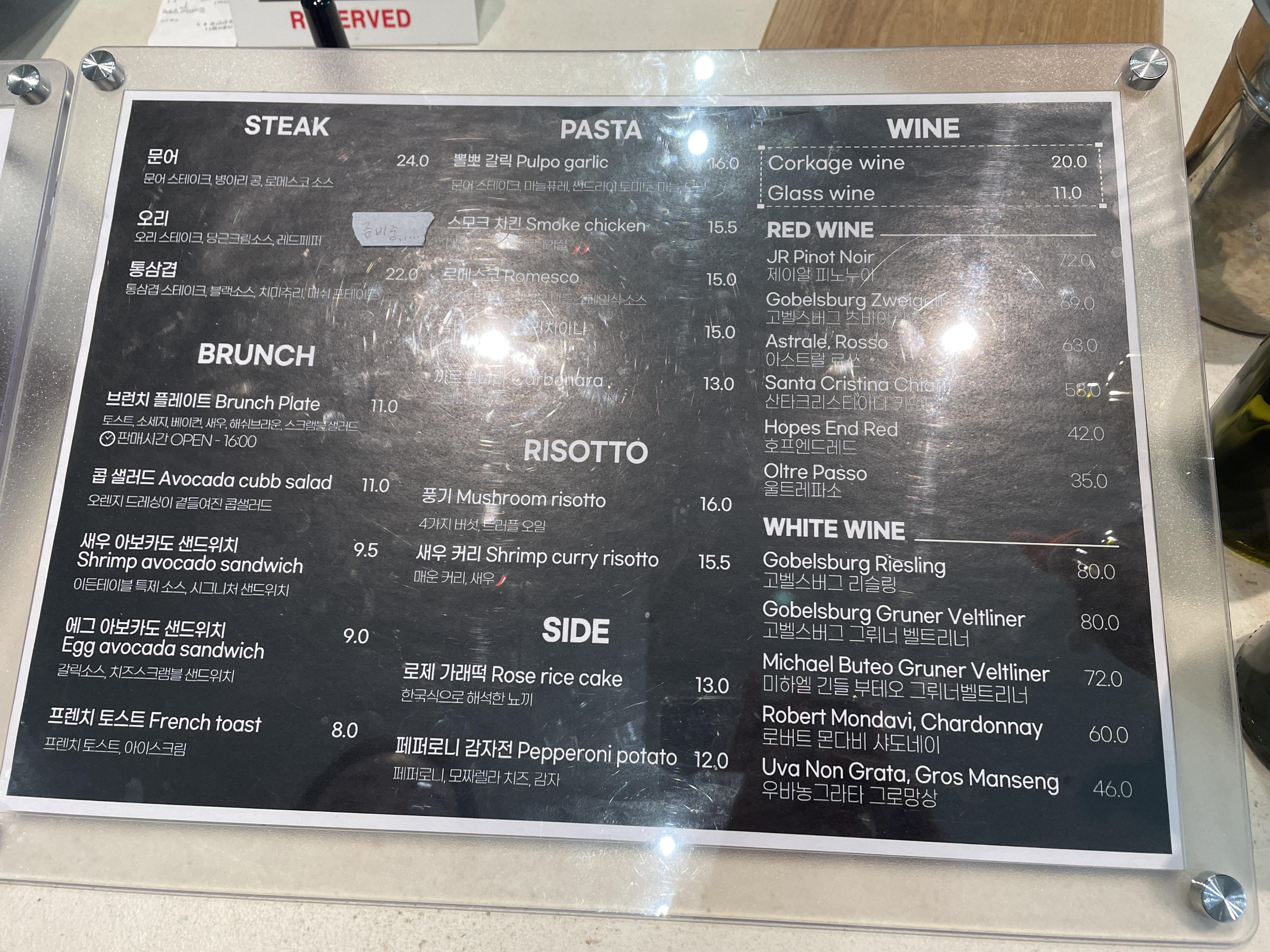 메뉴판입니다. 오후에는 커피만 마시러 올 수도 있을 것 같은데 점심에는 식사를 안하면 안되는 분위기입니다. (따로 제한이 있는지는 잘 모르겠어요) 메뉴는 파스타, 리조또 등의 식사 메뉴와 브런치 메뉴로 되어 있는 샌드위치류, 샐러드류, 프렌치 토스트, 스테이크는 소고기는 없고 문어, 오리, 통삼겹이 있었습니다. 사이드 메뉴는 와인 한 잔 하시면서 가볍게 시킬 수 있는 메뉴.