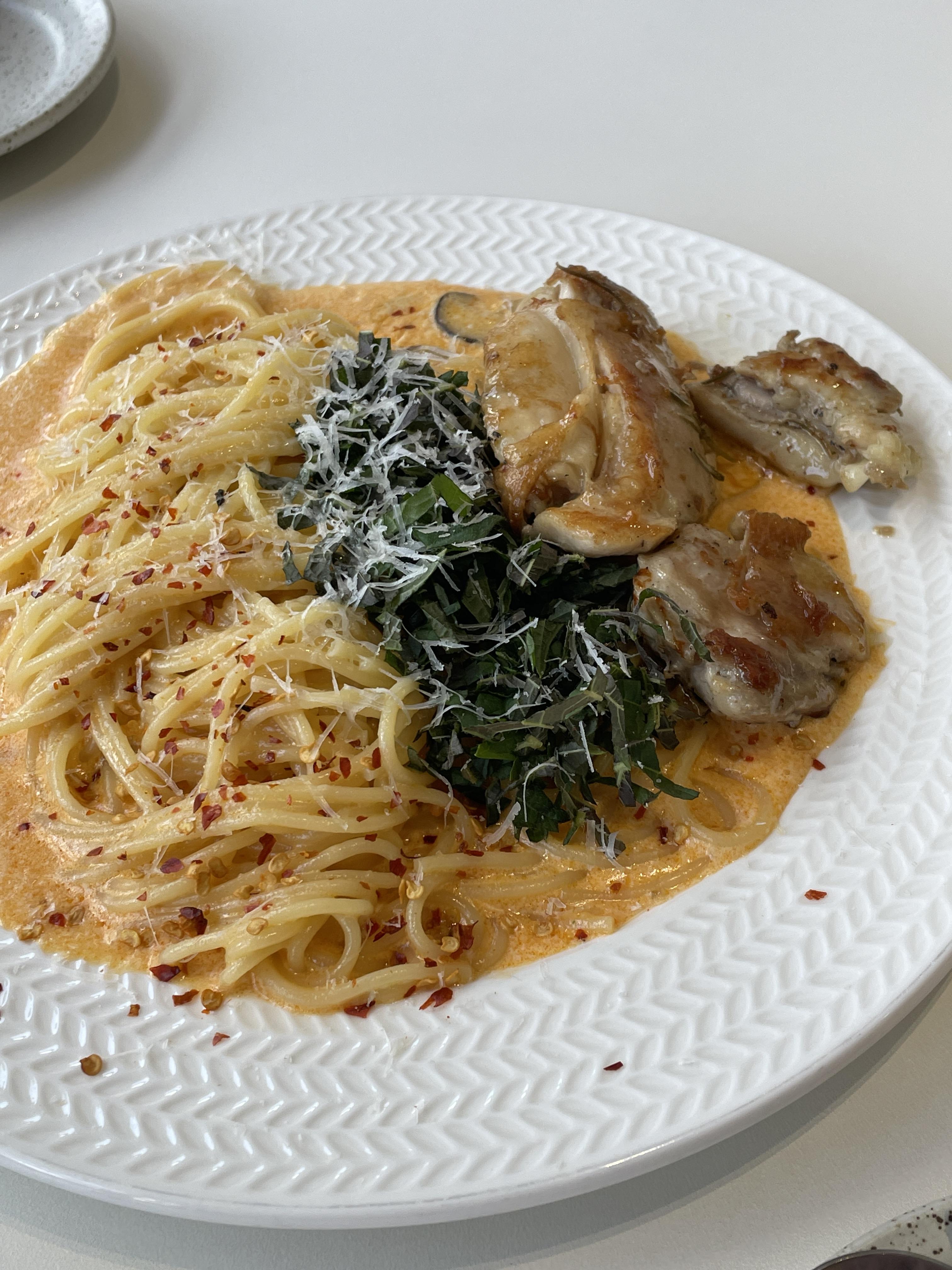 스모크 치킨은 약간 매콤한 메뉴 하나 시키려고 주문했는데 칼칼한 정도이고 크림 베이스라서 맵찔이도 드실 수 있는 정도입니다.