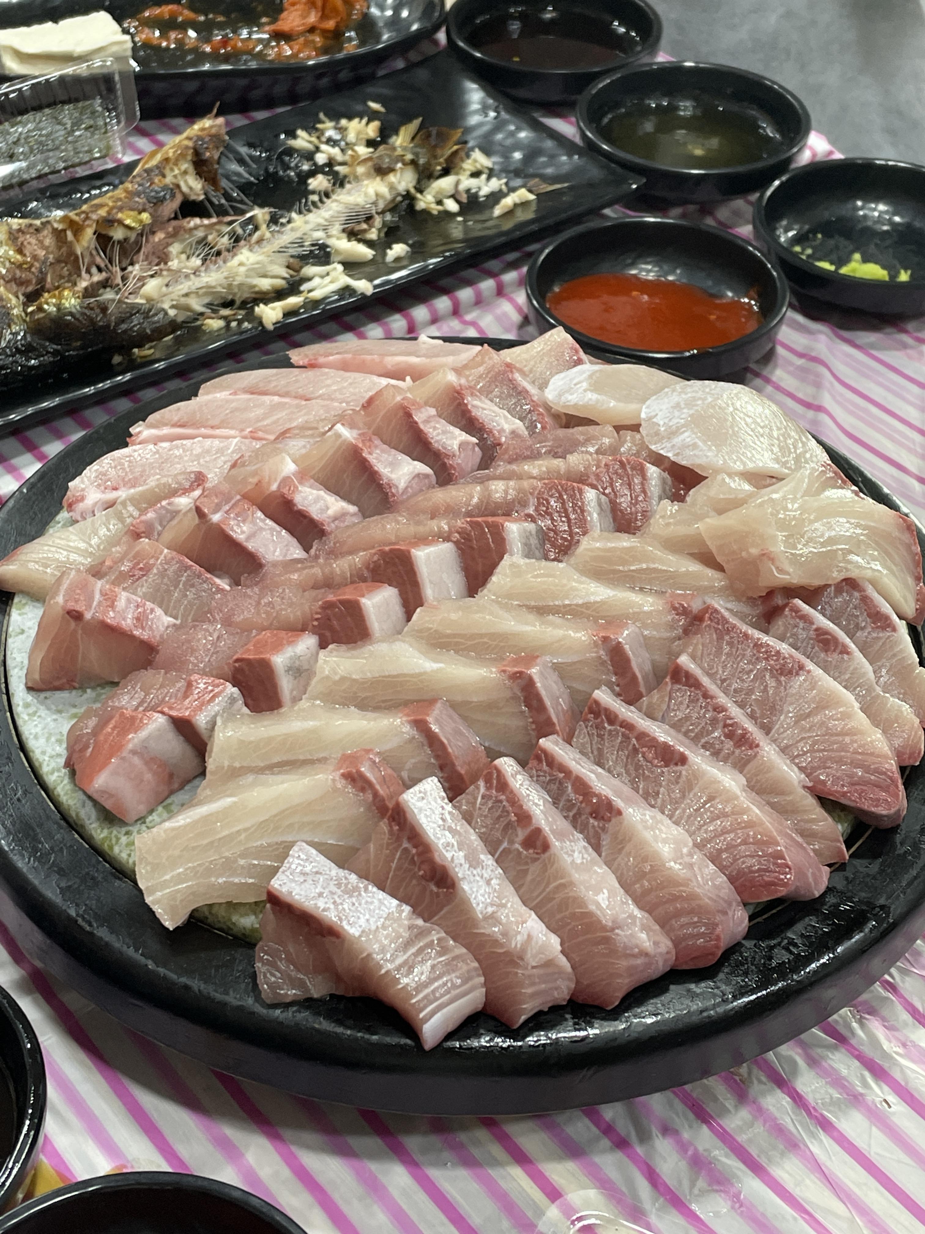 수제비는 기본적으로 사리에 들어갑니다. 다른 종류의 사리를 추가하려면 추가를 하실 수 있습니다. 매운탕은 무난한 맛이었습니다. 장사가 너무 잘 되서 바쁘셔서 그런지... 전반적으로 뭘 물어보기 조심스러운 기분... 자꾸 혼나는 기분.... 수산시장에서 대방어 떠서 먹어야지 하는 생각을 했습니다.