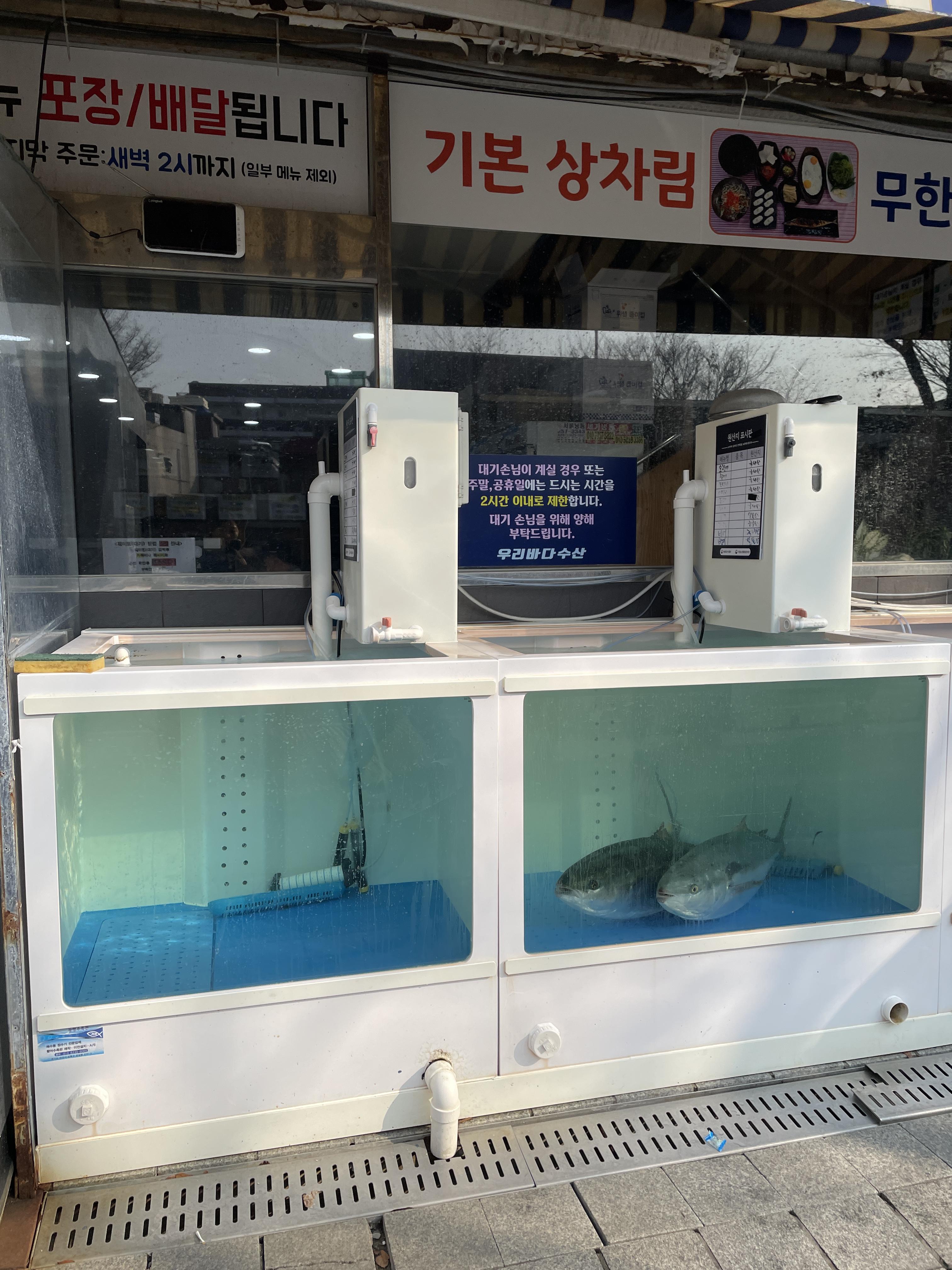 우리바다수산은 1층과 2층으로 이루어져 있는데요. 단체예약 (저는 5명 예약)을 하려고 하니 12시 30분 이후부터 2층 공간을 예약 받기 때문에 가장 빠르게 이용 가능한 시간이 12시 30분이라고 합니다.
