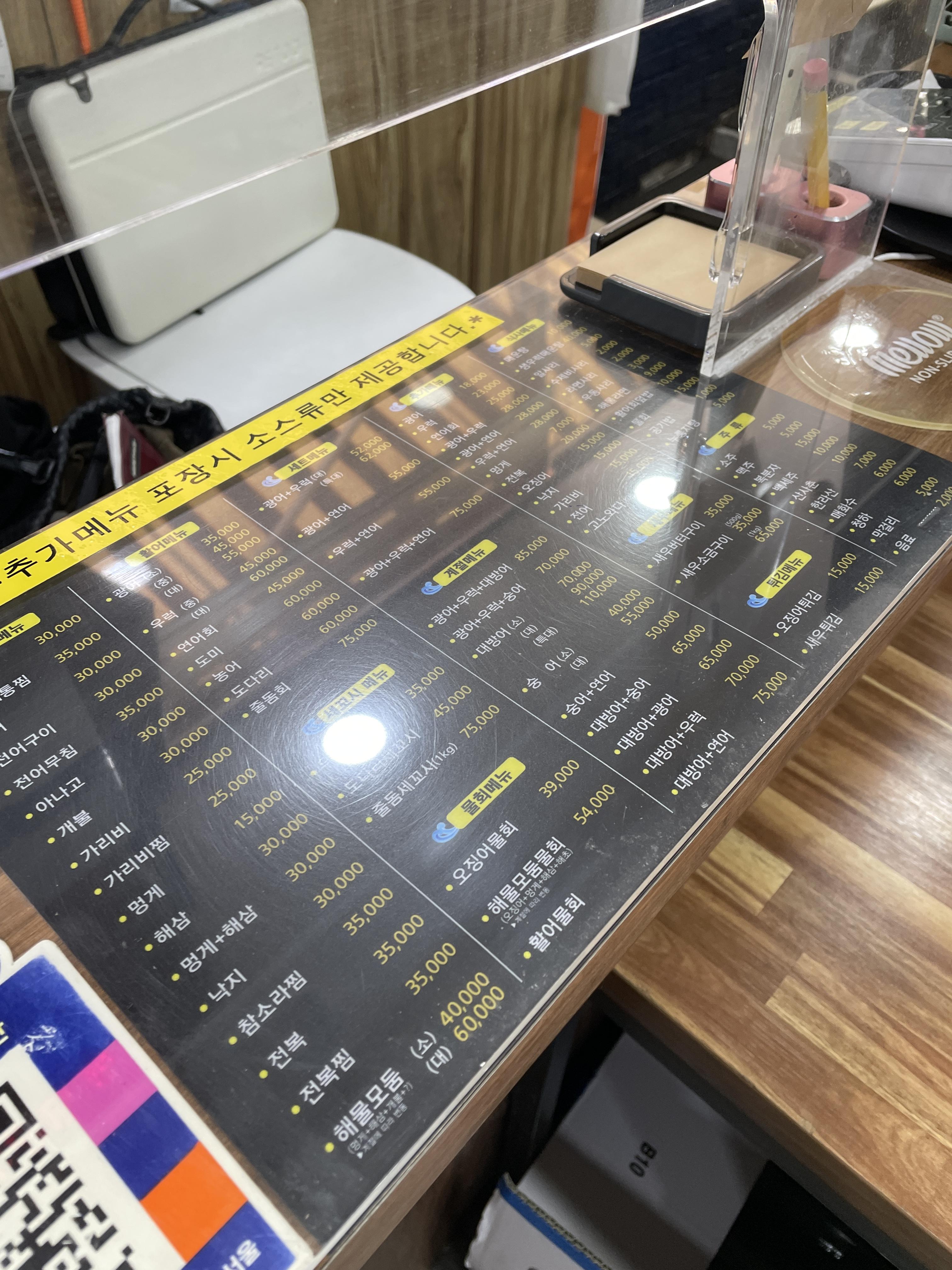 기본 메뉴, 활어 메뉴들. 오징어 통찜 같은 것도 맛있겠네요.