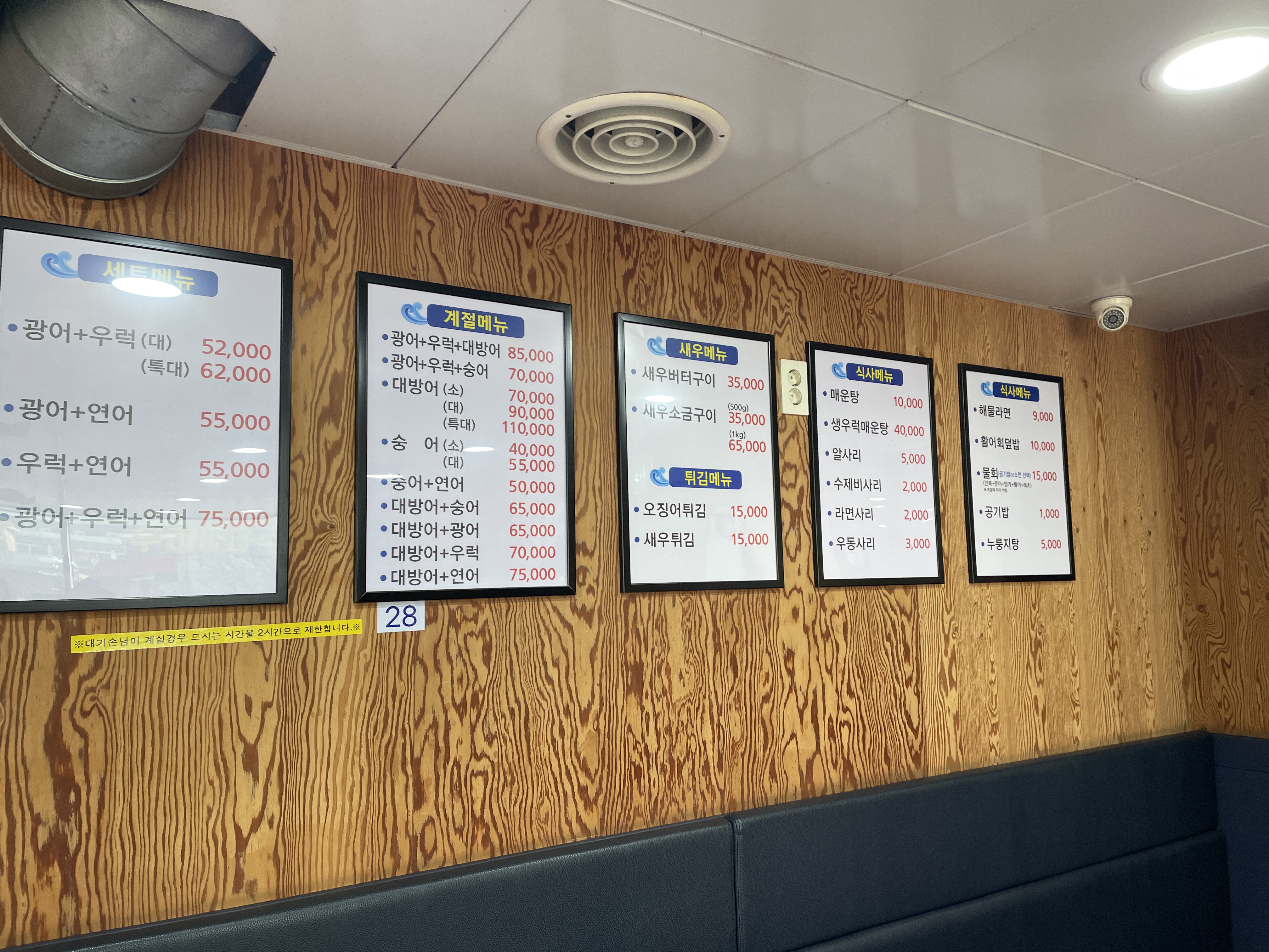 메뉴나 보면서 기다립니다. 예약을 했는데 12시30분까지 3분을 더 기다렸어요. 정시에 올려보내 줄 건가 봅니다. 회 포장도 가능합니다.