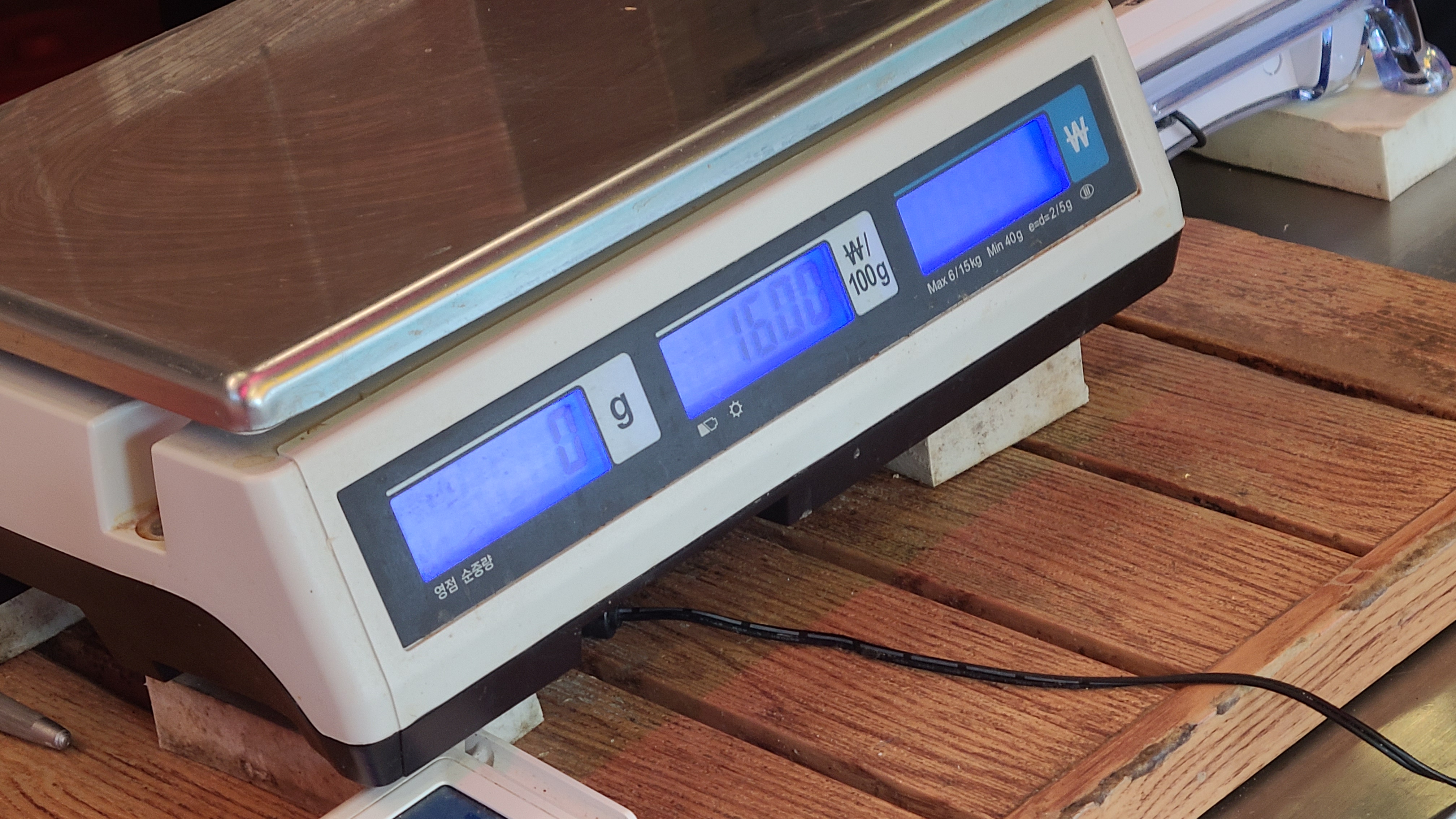 100그램당 1,600원으로 책정돼 있는 듯하다. 우리가 산 1줄은 8,500원이었다. 500그램이 조금 넘었나보다. 내가 볼 때는 말도 안 되게 저렴한 가격이다.