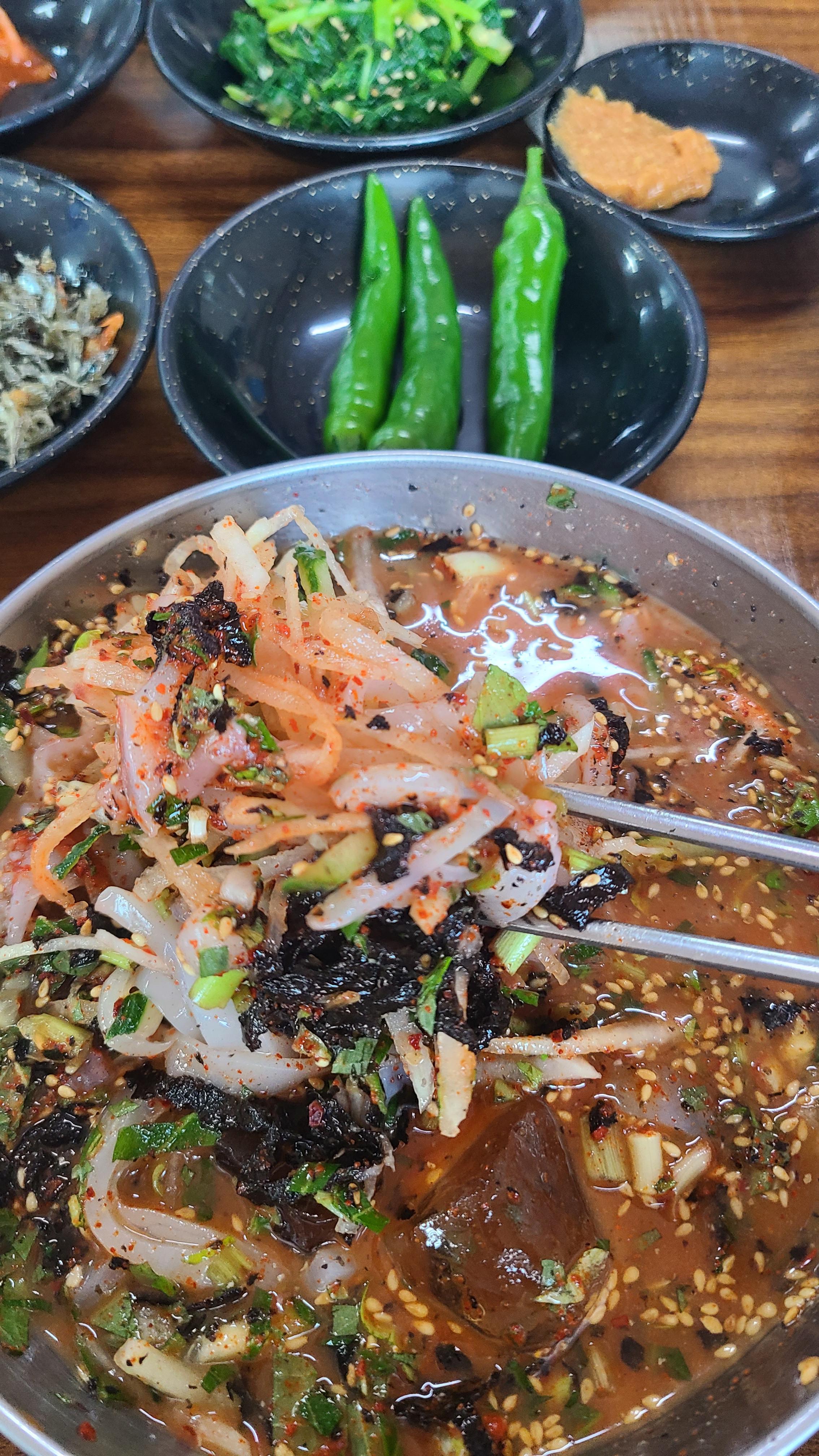 역시 한치의 식감이 좋다. 냉동 아니면 더 신선하고 맛있었으려나. 냉동도 나쁘지 않았다. 국물에서는 일반 초장의 새콤달콤한 맛이 아니라 구수한 맛이 미묘하게 깔린다. 시원해서 파카입고 먹었다.
