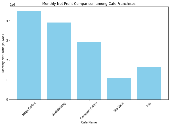 아래 <차트>는 저가 커피 브랜드별 순이익을 비교한 막대 그래프이다. 메가커피가 순이익이 가장 크고, 그 다음이 빽다방 > 컴포즈커피 > 이디아 > 더벤티이다.