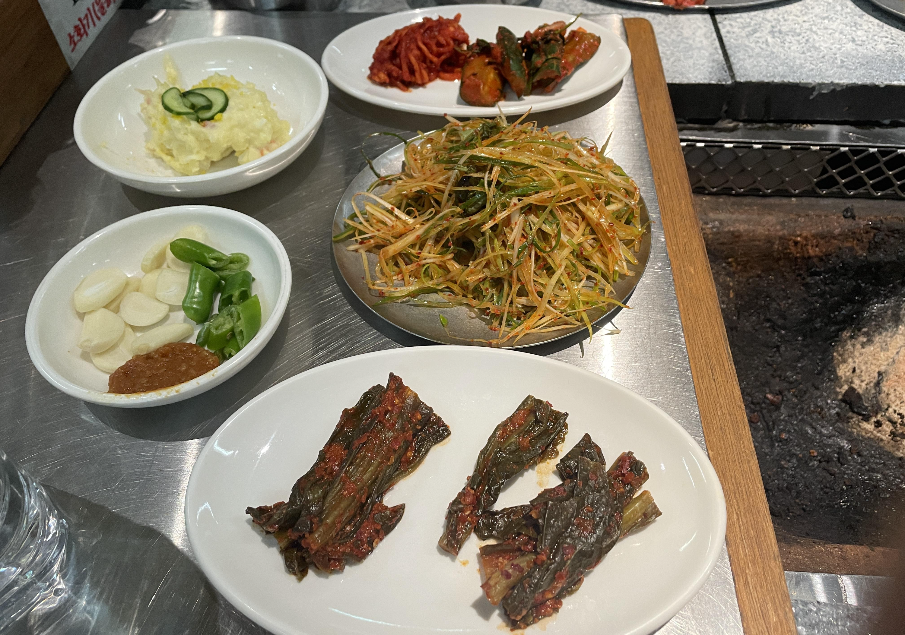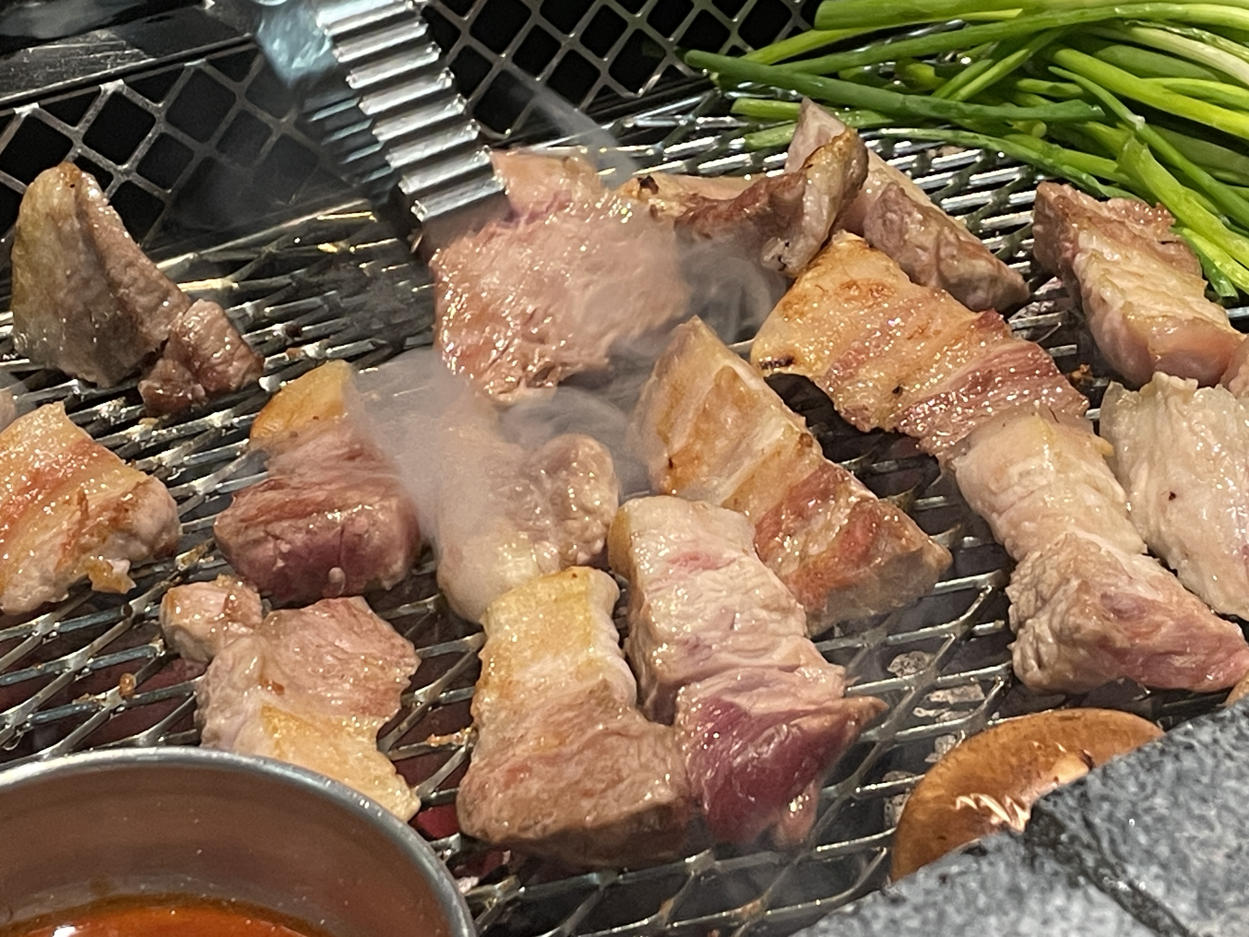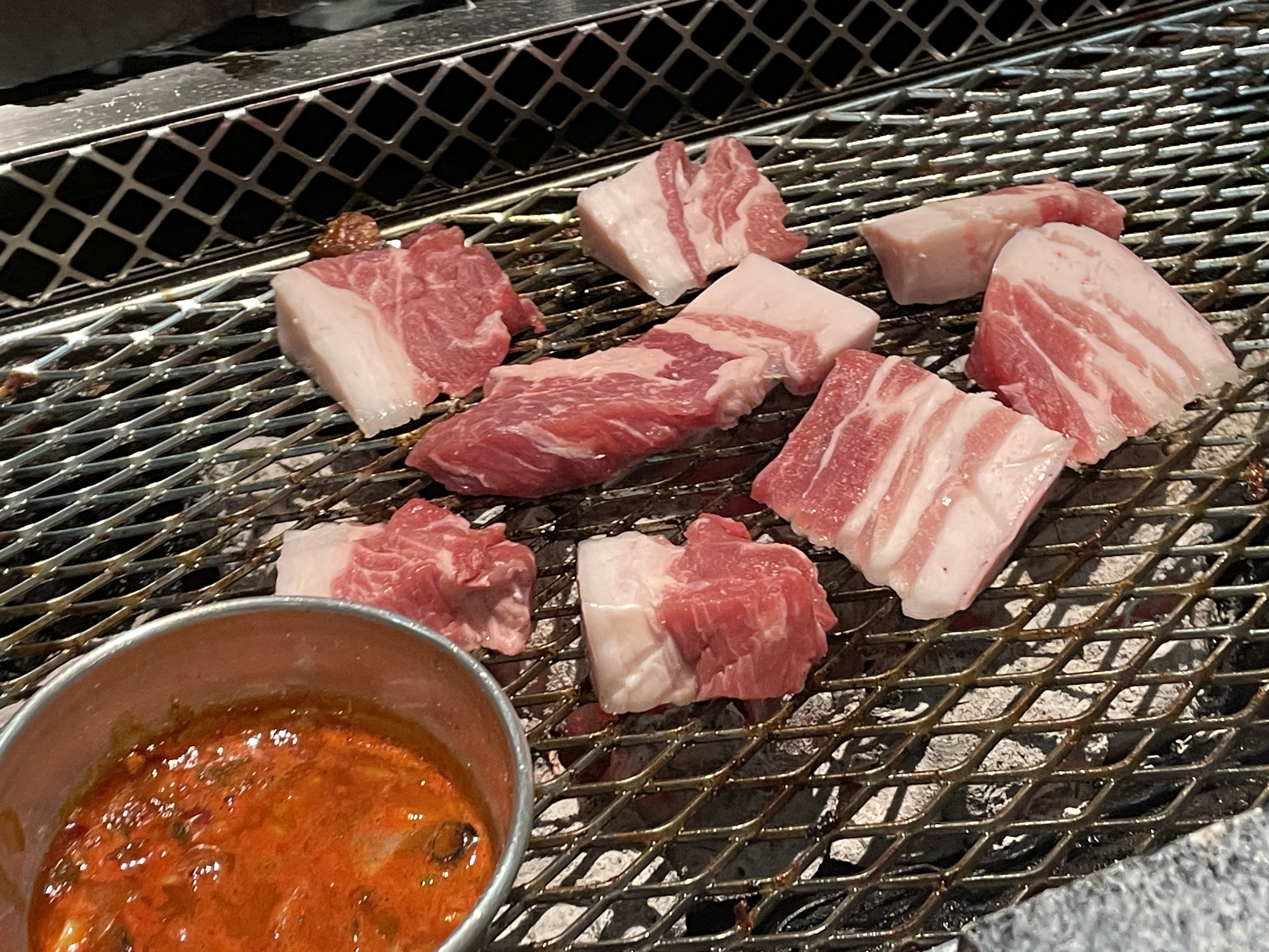 고기가 꽤 빨리 나온다. 때깔 좋은 고기가 세팅되고 직원분이 자리를 잡고 구워주신다. 처음에만 구워주신다. 그 다음부터는 알아서 구워먹는 방식이다. 그런데 고기 굽는 자리가 꽤 불편하다. 직원분이 서실 자리가 없다. 다행히 3명이 가서 한 자리를 차지하고 고기를 구워주셨다.