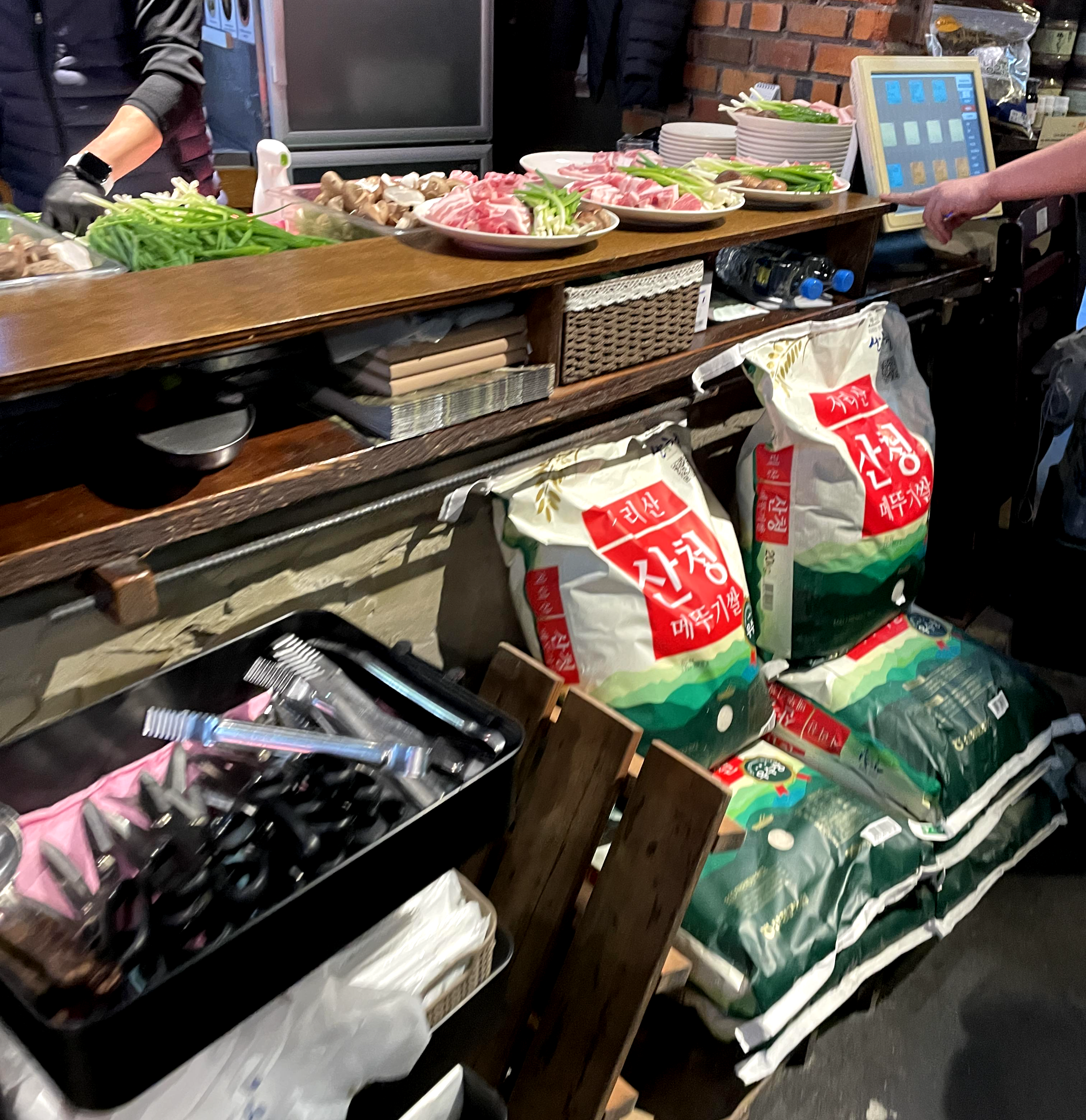 매장을 들어가면 자연스럽게 이곳에서 사용하는 식재료들로 고기를 자르는 곳이 꾸며져 있어 신선하고 내추럴한 연출을 보여준다. 산청이라는 컨셉답게 쌀도 산청 메뚜기쌀이 쌓여져 있다. 실제로 인터넷에서도 쉽게 구매할 수 있는 쌀이다.