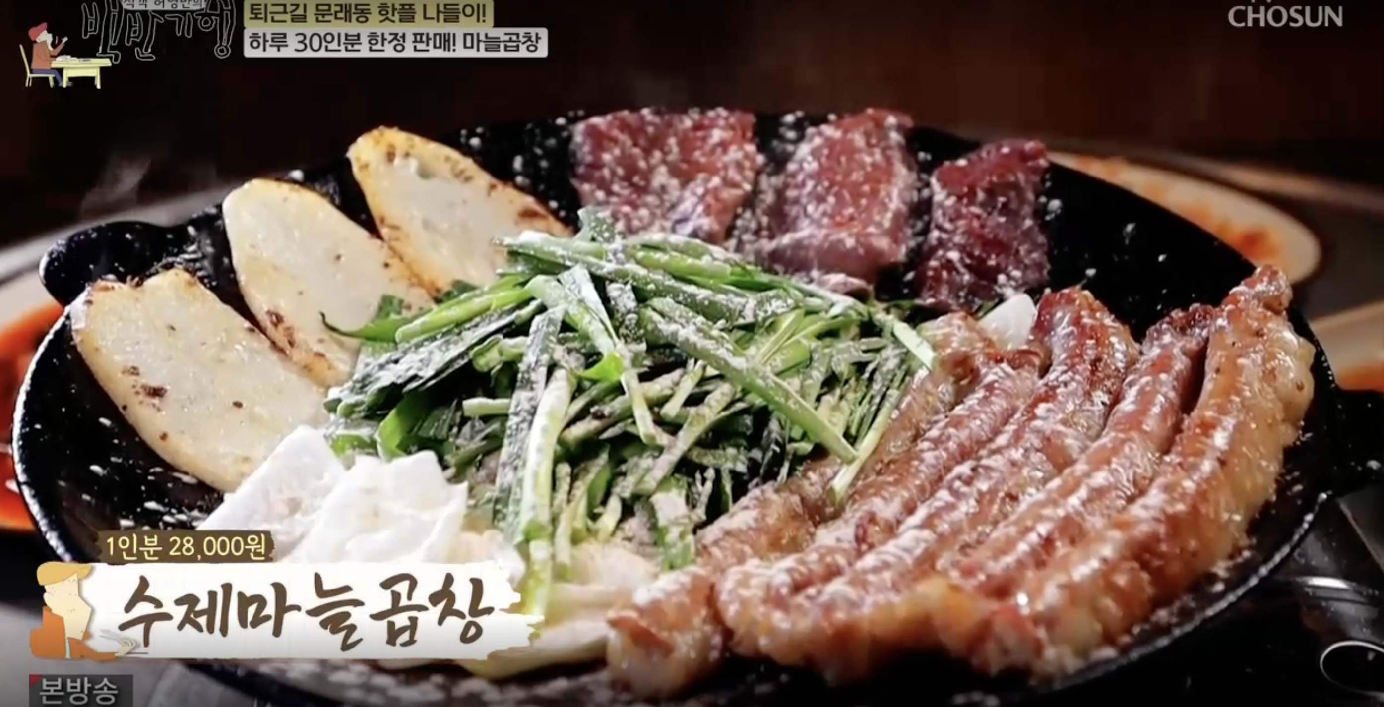마늘가루가 뿌려진 수제 마늘 곱창. 1인분 28,000원.