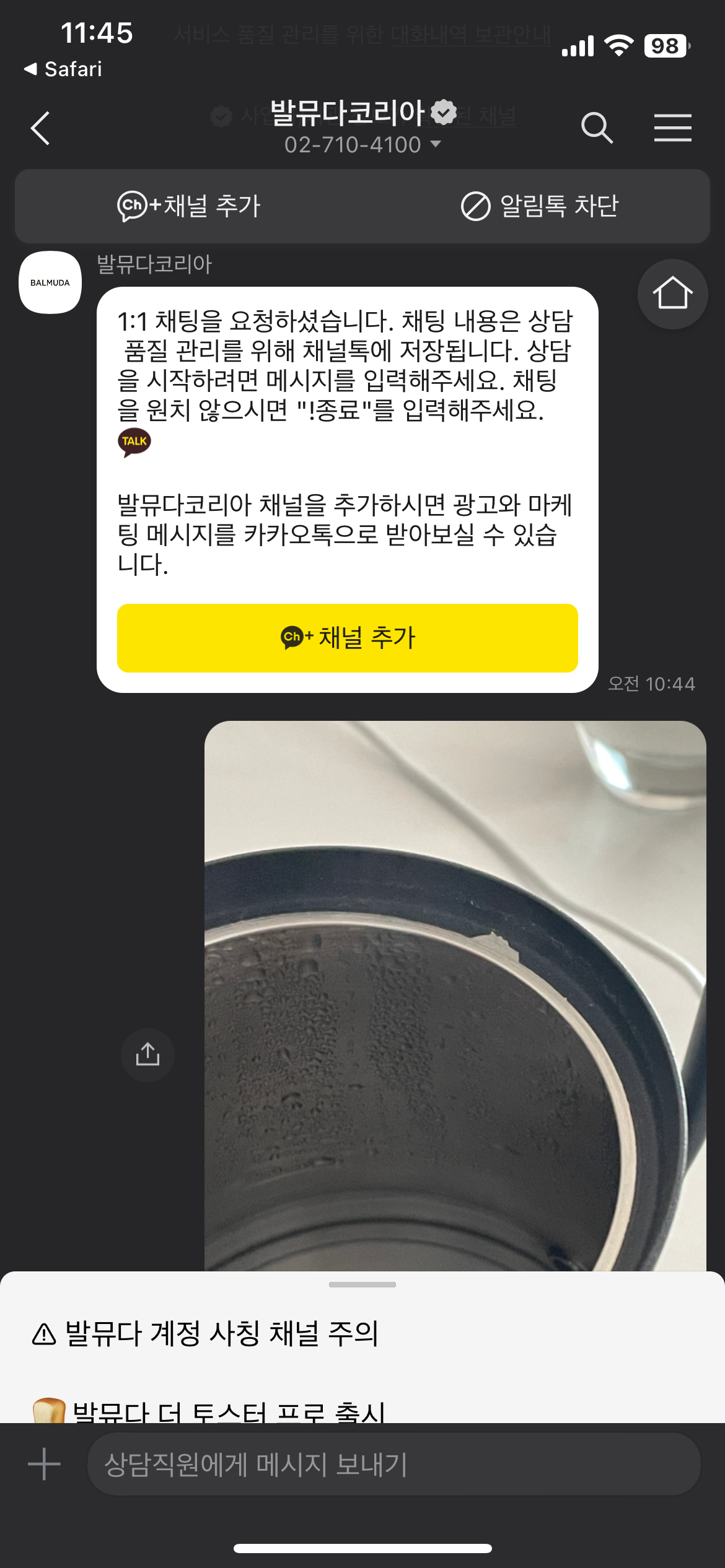이외에 전기포트 안쪽에 까임이 있어 문의할 일이 있어서 카카오톡으로 문의했더니 빠르게 답변을 받을 수 있었다.