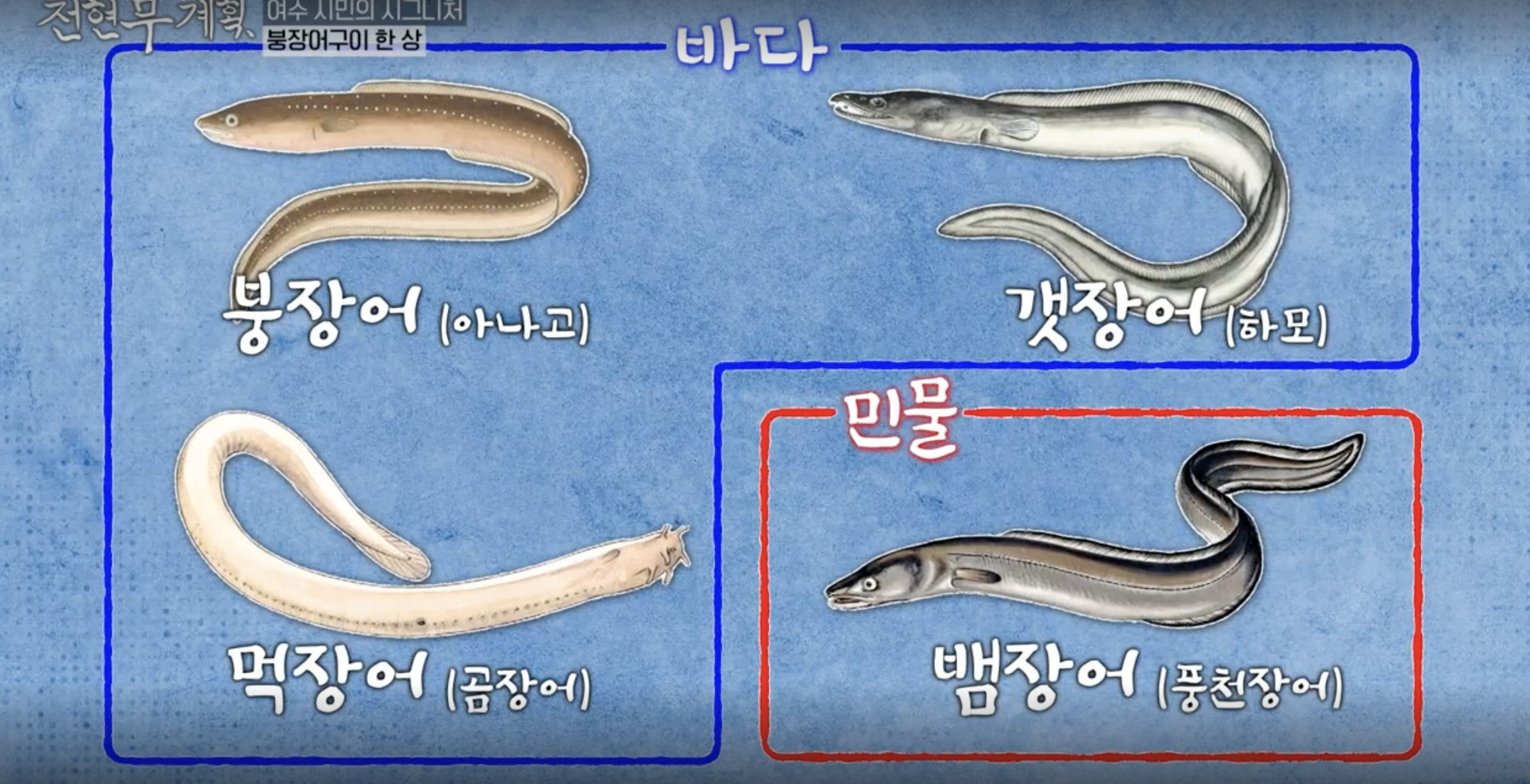 뱀장어는 바다에서 태어나서 강에서 자란다. 부드럽고 담백한 특징이 있다. 곰장어는 씹을수록 은은한 단맛과 쫄깃함이 특징이다. 갯장어는 여수의 명믈로 샤브샤브로 즐기는 편이다. 붕장어는 뼈째도 많이 먹고 담백질 함량이 높다.