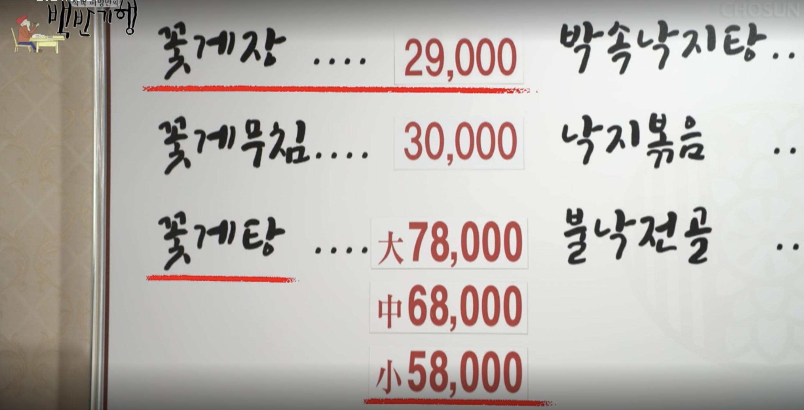 꽃게장 29,000원, 꽃게탕 58,000원~78,000원.