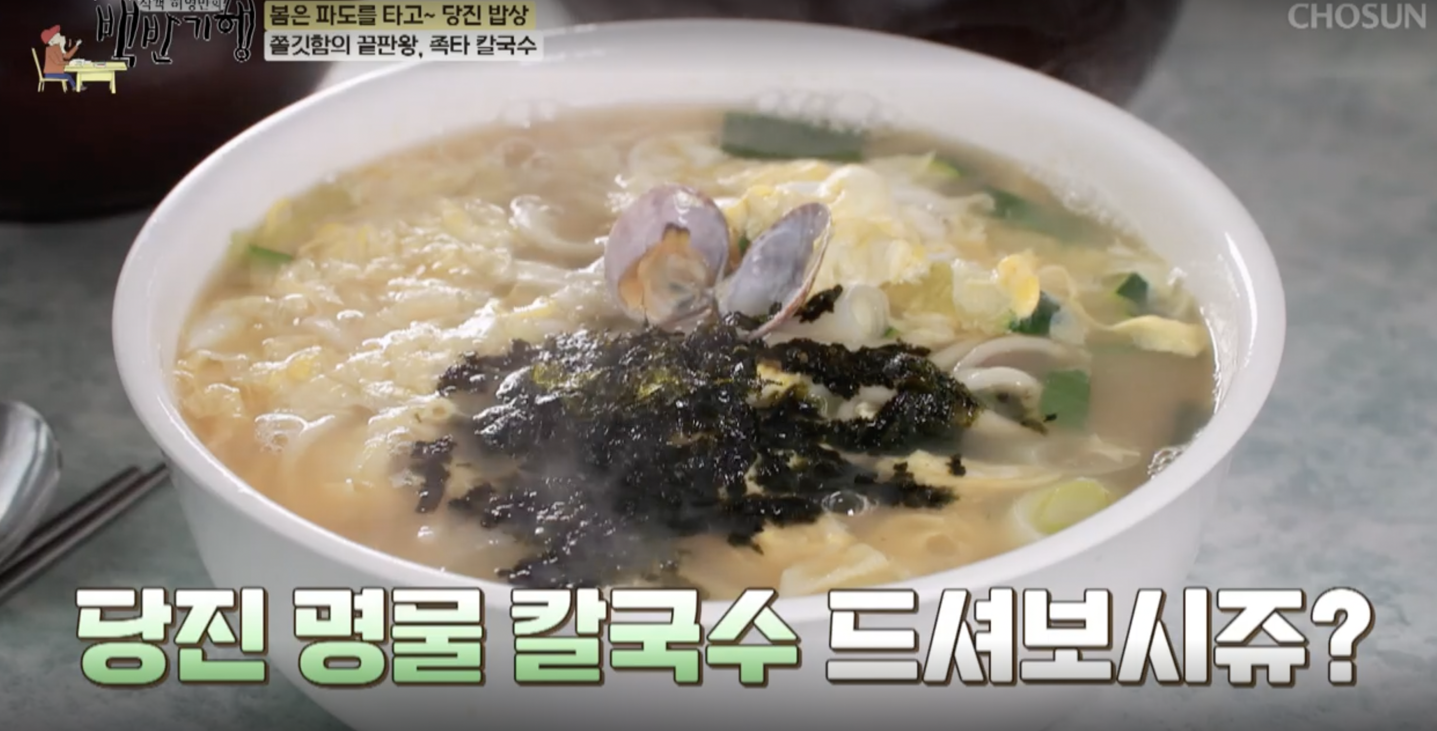 당진 명물 칼국수. 면발이 아주 쫄깃하다. 9천 원의 푸짐한 한그릇. 국물이 걸쭉해 보이지만 맛은 아주 개운하고 시원하다. 딱 7분~7분 30초만 삶아내는 것도 비법.